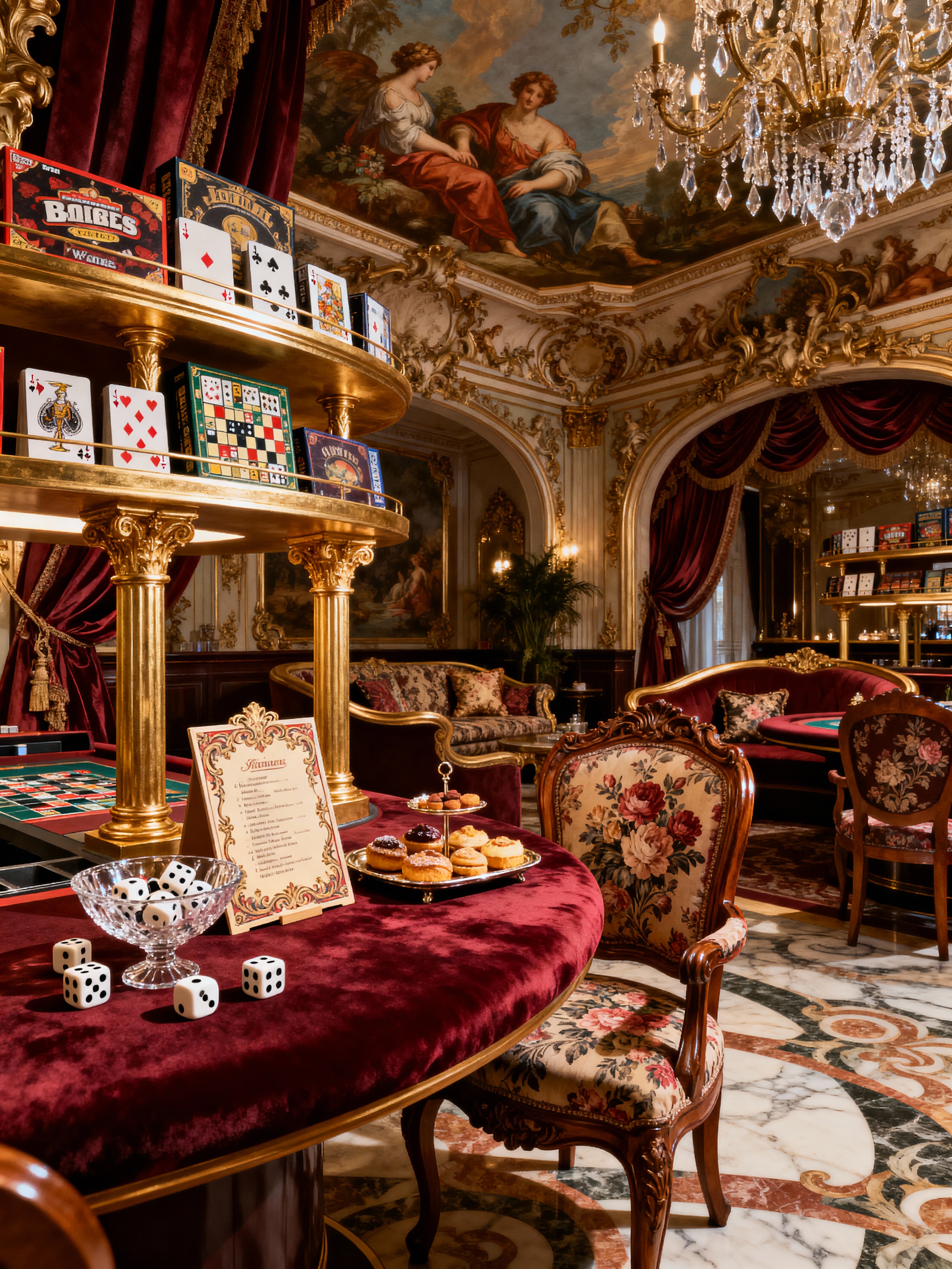 board game cafe with baroque style with playing cards and board games and game shelves and dice and game tables and snacks and menu boards and cozy lighting. . with pedestal feet and movement and expensive and plush flooring and luxurious floral and damask fabrics and emotional exuberance and sensuous richness and drama and elaborate ornamentation