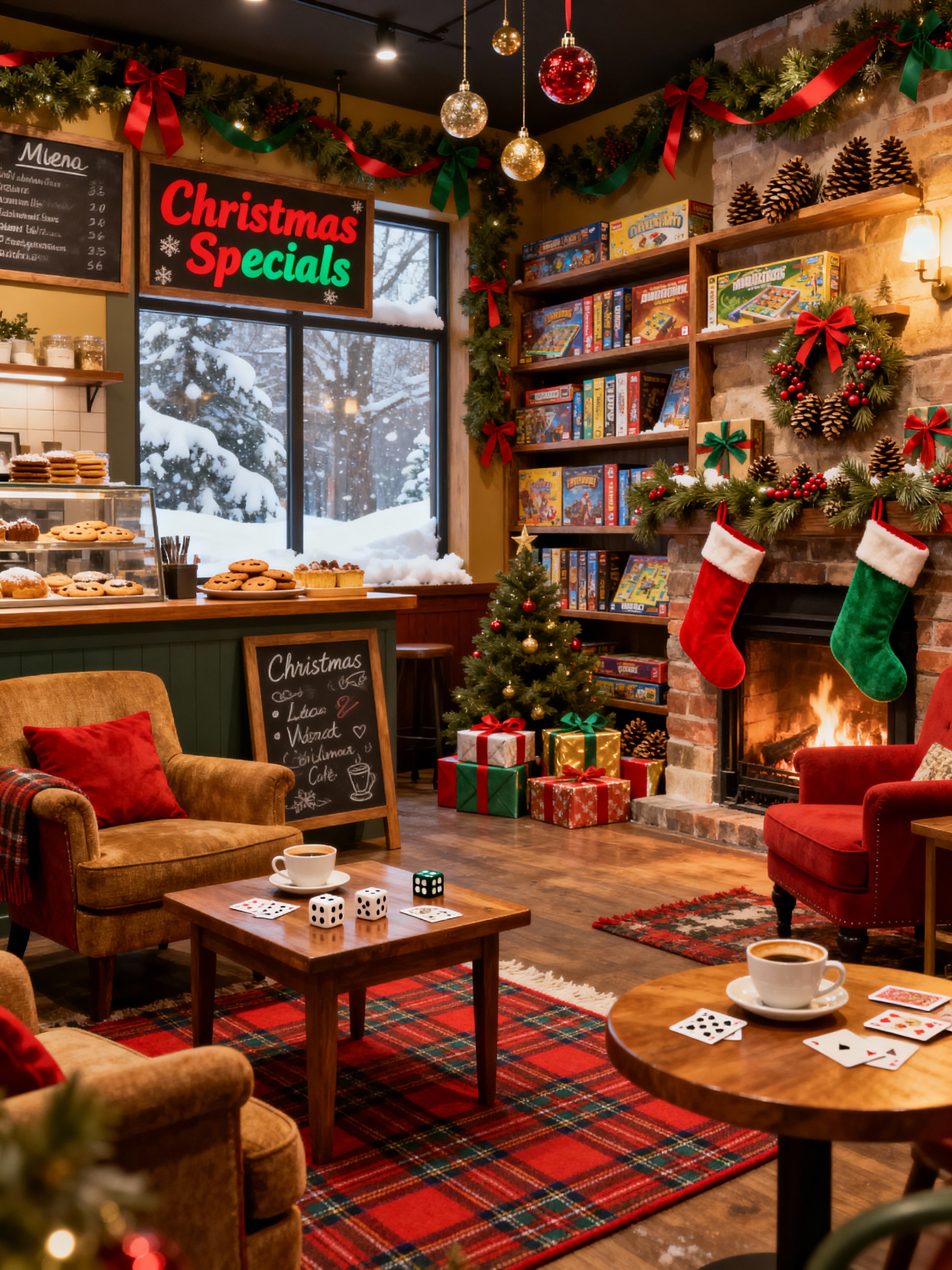 board game cafe with christmas style with coffee cups and dice and menu boards and snacks and comfortable chairs and playing cards and game shelves and cozy lighting. . with snow outside and ribbons and giftwrapped gifts and tie pinecones and berries and berries and greenery draped and plaid rugs and christmas ornaments and a few big socks hanging