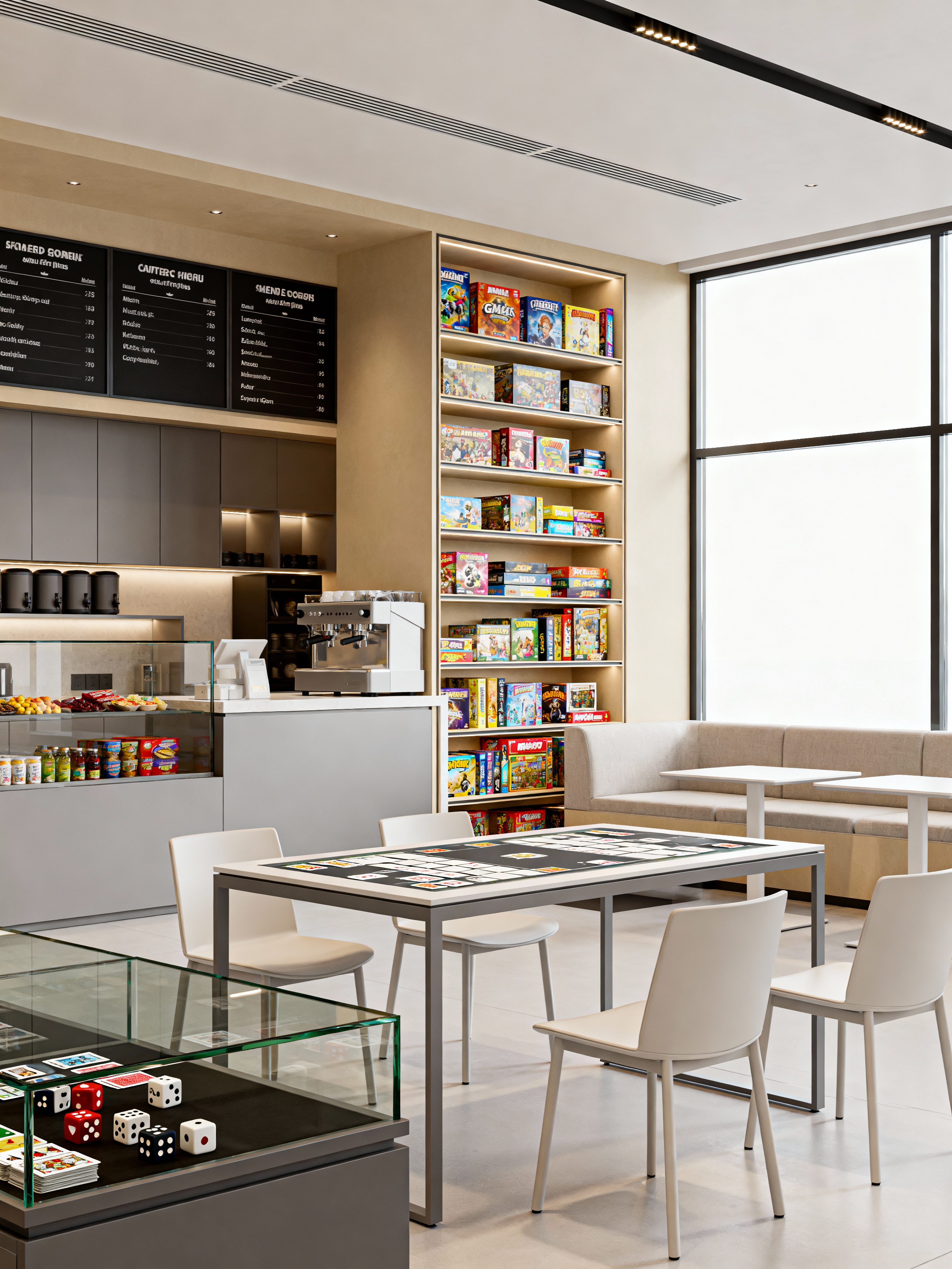 board game cafe with contemporary style with dice and game shelves and snacks and game tables and playing cards and menu boards and board games and comfortable chairs. . with open spaces and neutral palette and minimalist and glass decor and modern finishes and functional design and sleek lines and high contrast
