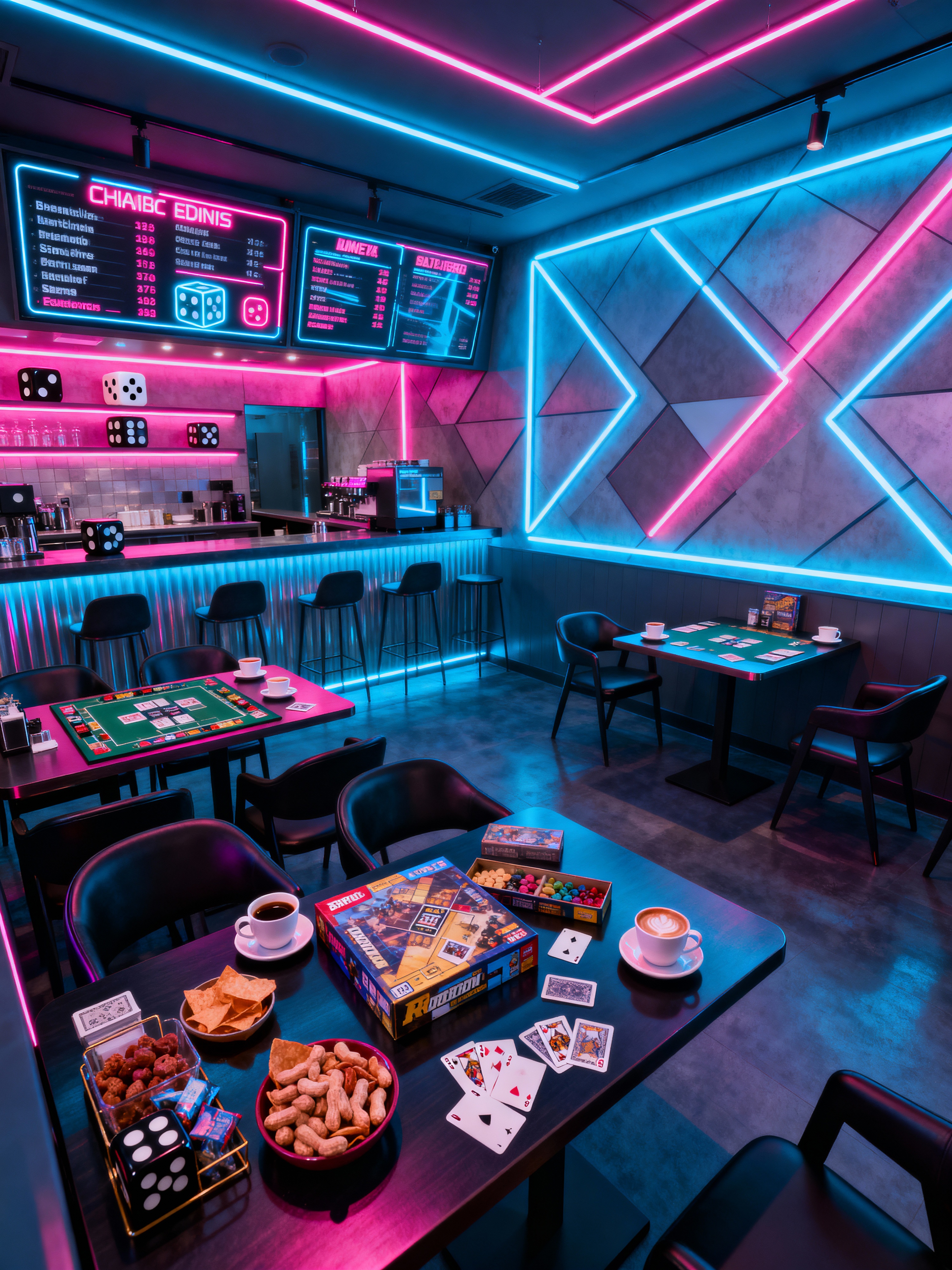 board game cafe with cyberpunk style with menu boards and dice and coffee cups and game tables and snacks and comfortable chairs and board games and playing cards. . with cyberpunk lights and cyberpunk lights and synthetic objects and strong geometric walls and bladerunner lights and led lights and minimalist and futuristic cybernetic details
