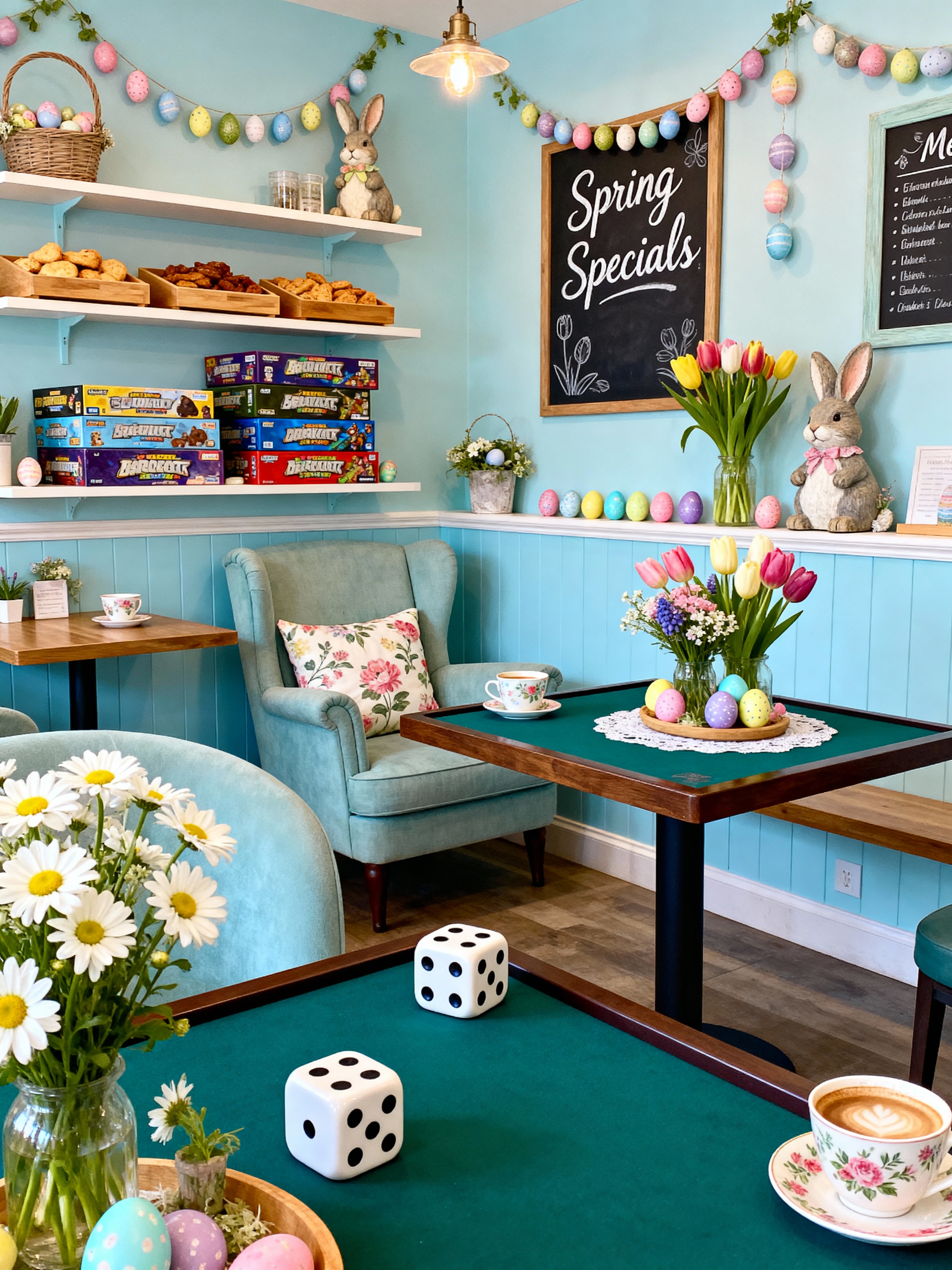 board game cafe with easter style with snacks and comfortable chairs and dice and menu boards and board games and coffee cups and game shelves and game tables. . with colorful easter eggs and light blue colors and flowers on table and easter decorations and spring decorations and colorful easter eggs