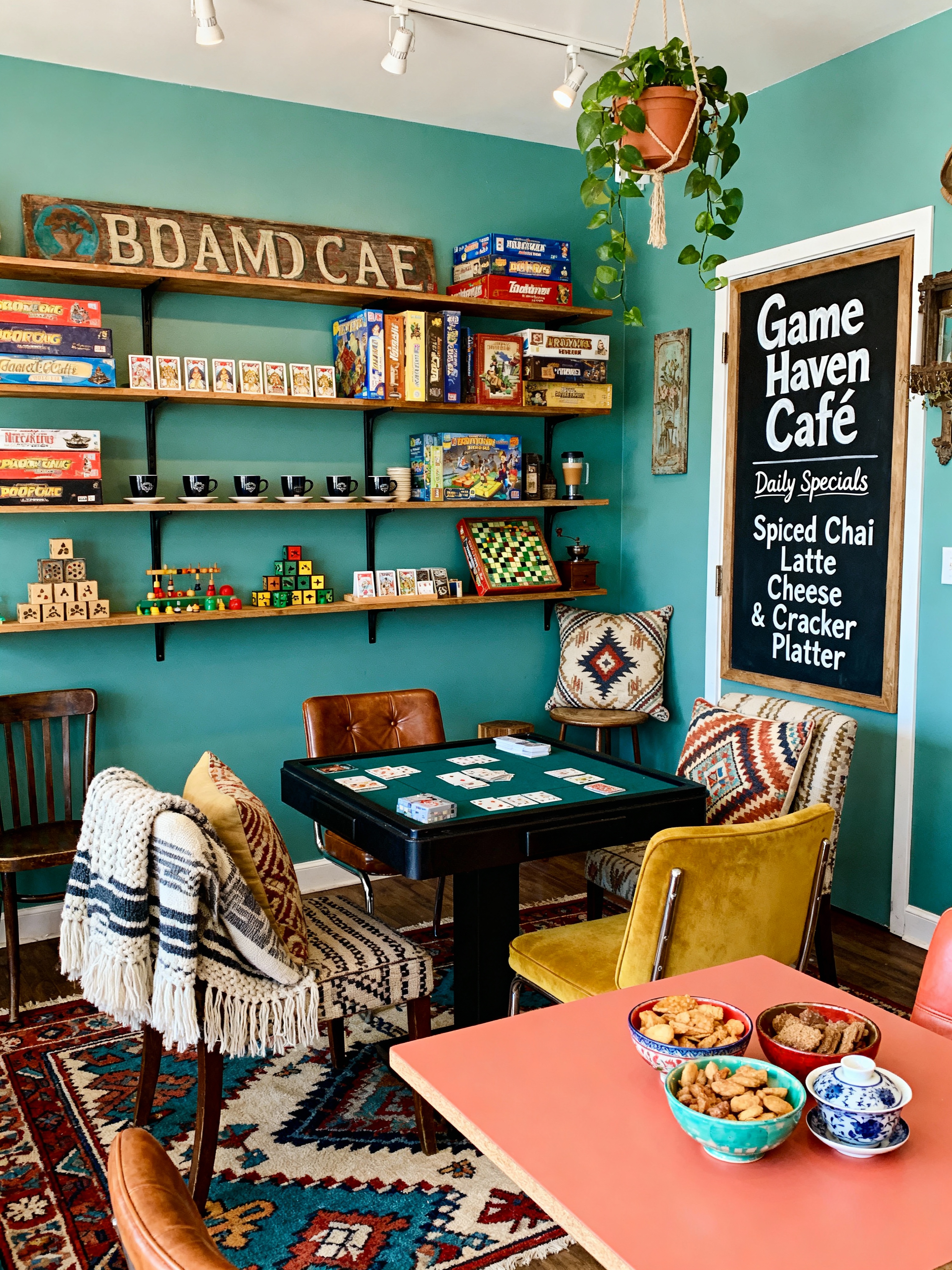 board game cafe with eclectic style with game shelves and menu boards and comfortable chairs and snacks and playing cards and game tables and board games and coffee cups. . with global influences and mixed styles and bold combinations and vintage finds and unexpected elements and colorful palette and layered textures and personal expression