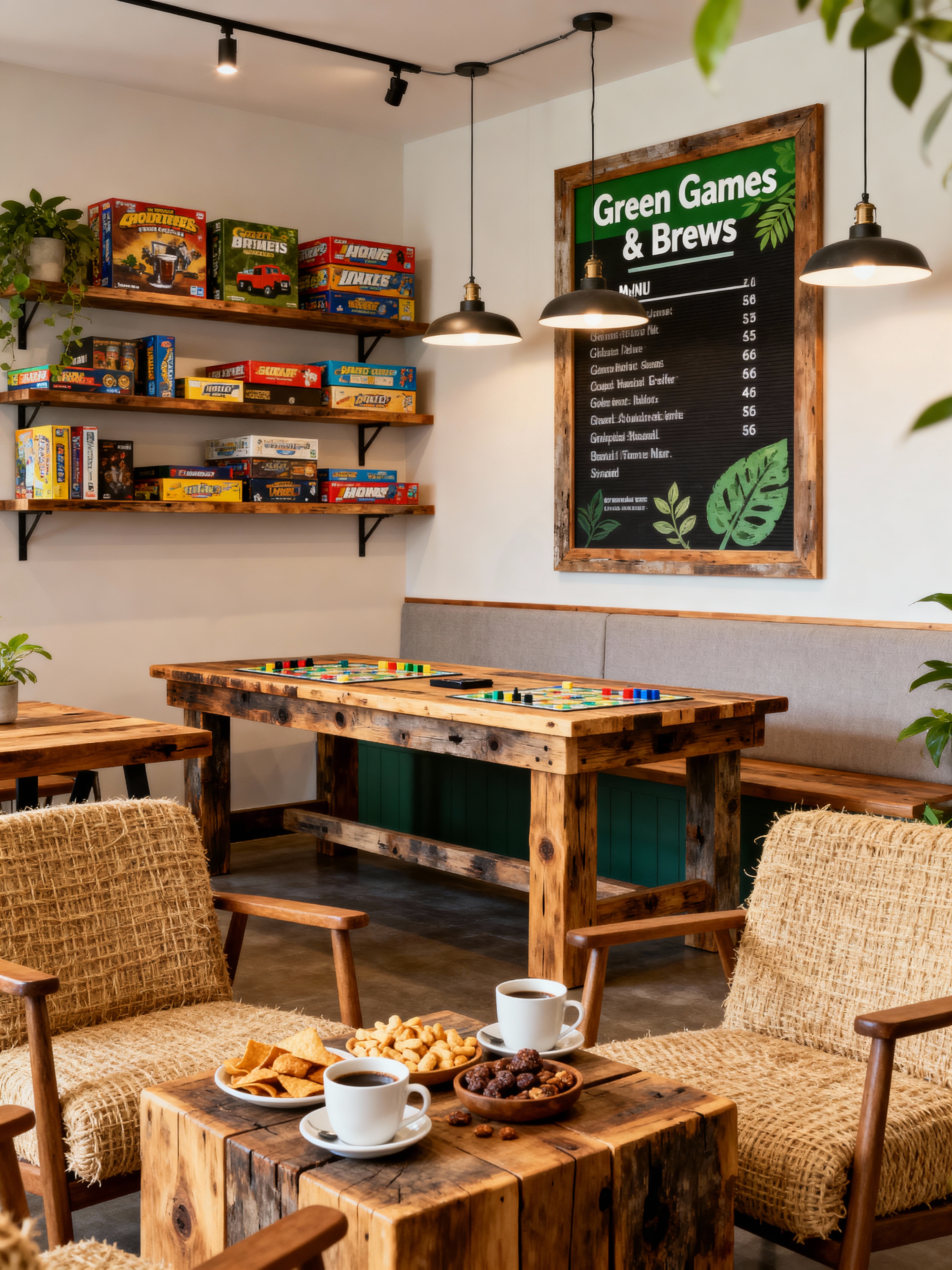 board game cafe with eco-friendly style with coffee cups and comfortable chairs and snacks and menu boards and game shelves and game tables and board games and cozy lighting. . with non-toxic finishes and sustainable materials and reclaimed wood and energy efficient and natural fibers and green living and environmentally conscious and recycled elements
