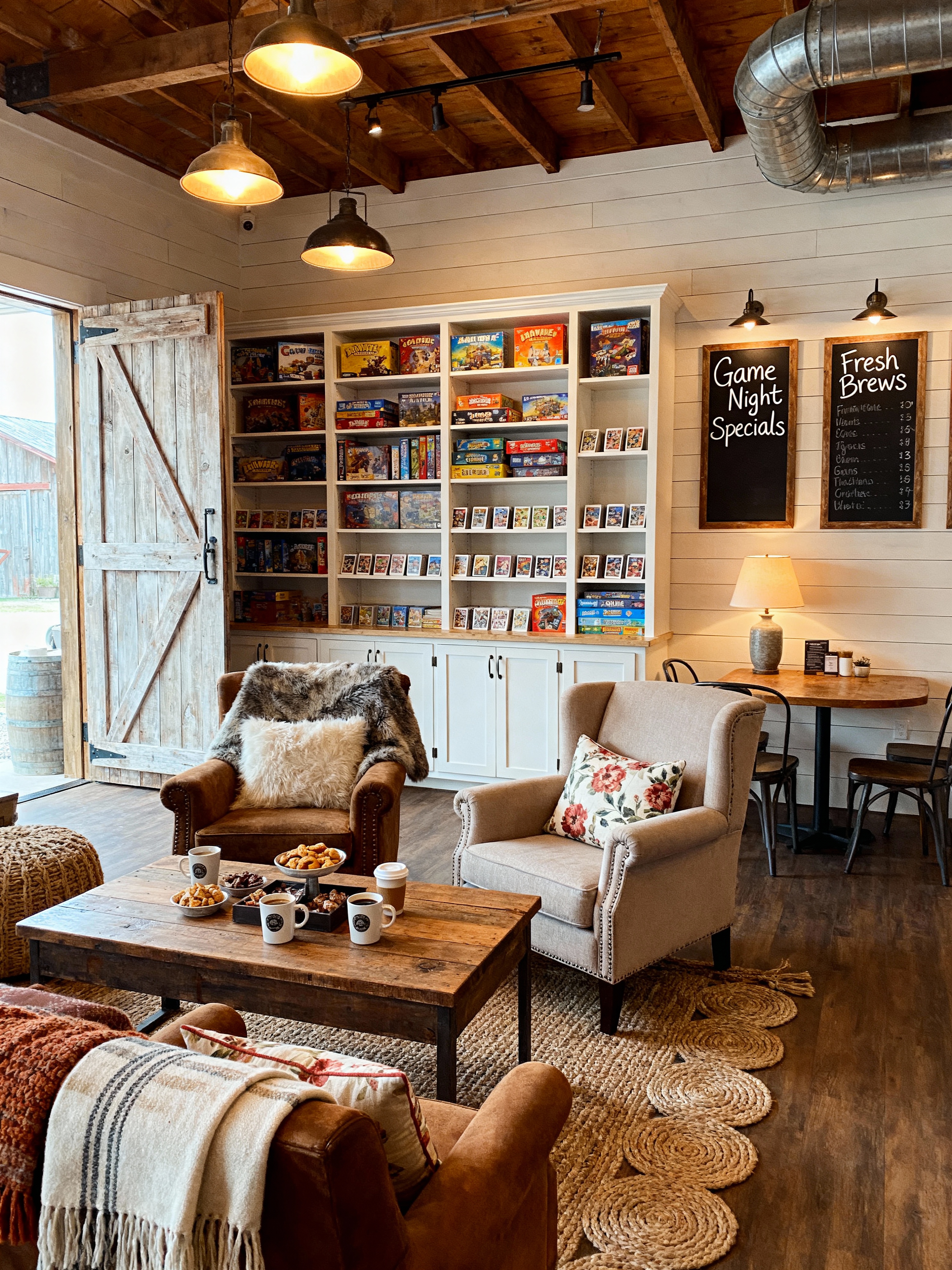 board game cafe with farmhouse style with game shelves and snacks and coffee cups and comfortable chairs and cozy lighting and playing cards and board games and menu boards. . with cozy feel and shiplap walls and country style and open shelving and barn doors and exposed wood and industrial accents and rustic charm