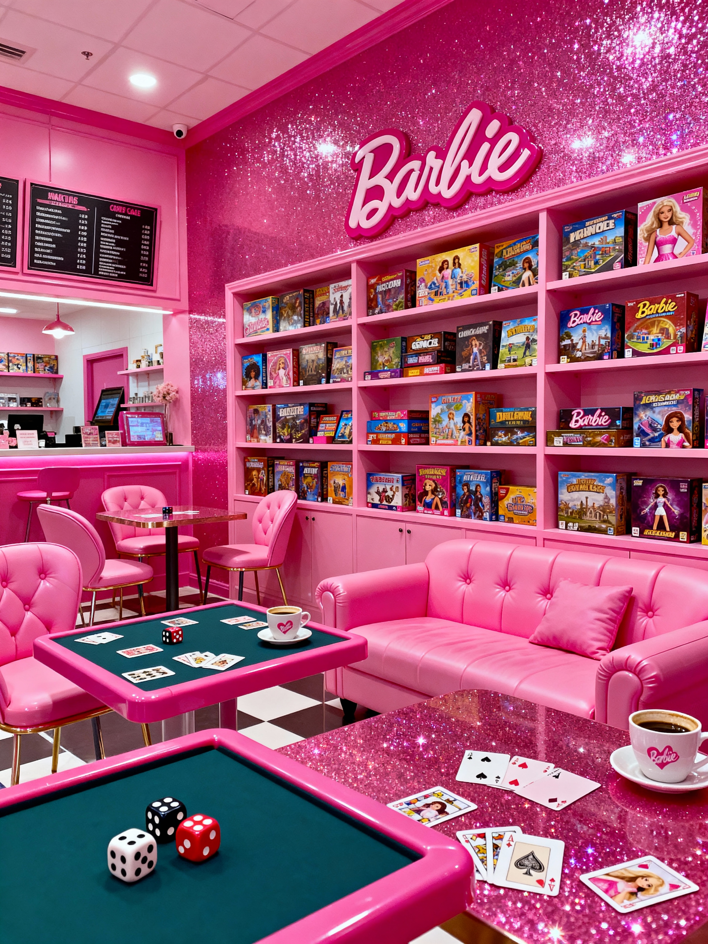 board game cafe with hot pink style with dice and coffee cups and menu boards and playing cards and board games and comfortable chairs and game shelves and game tables. . with hot pink barbie walls and barbie glitter and sparkle and barbie bold rosy hues like fuchsia and magenta and hot pink barbie colors and barbie plastic interior and barbie chairs and barbie sofa and barbie style interior