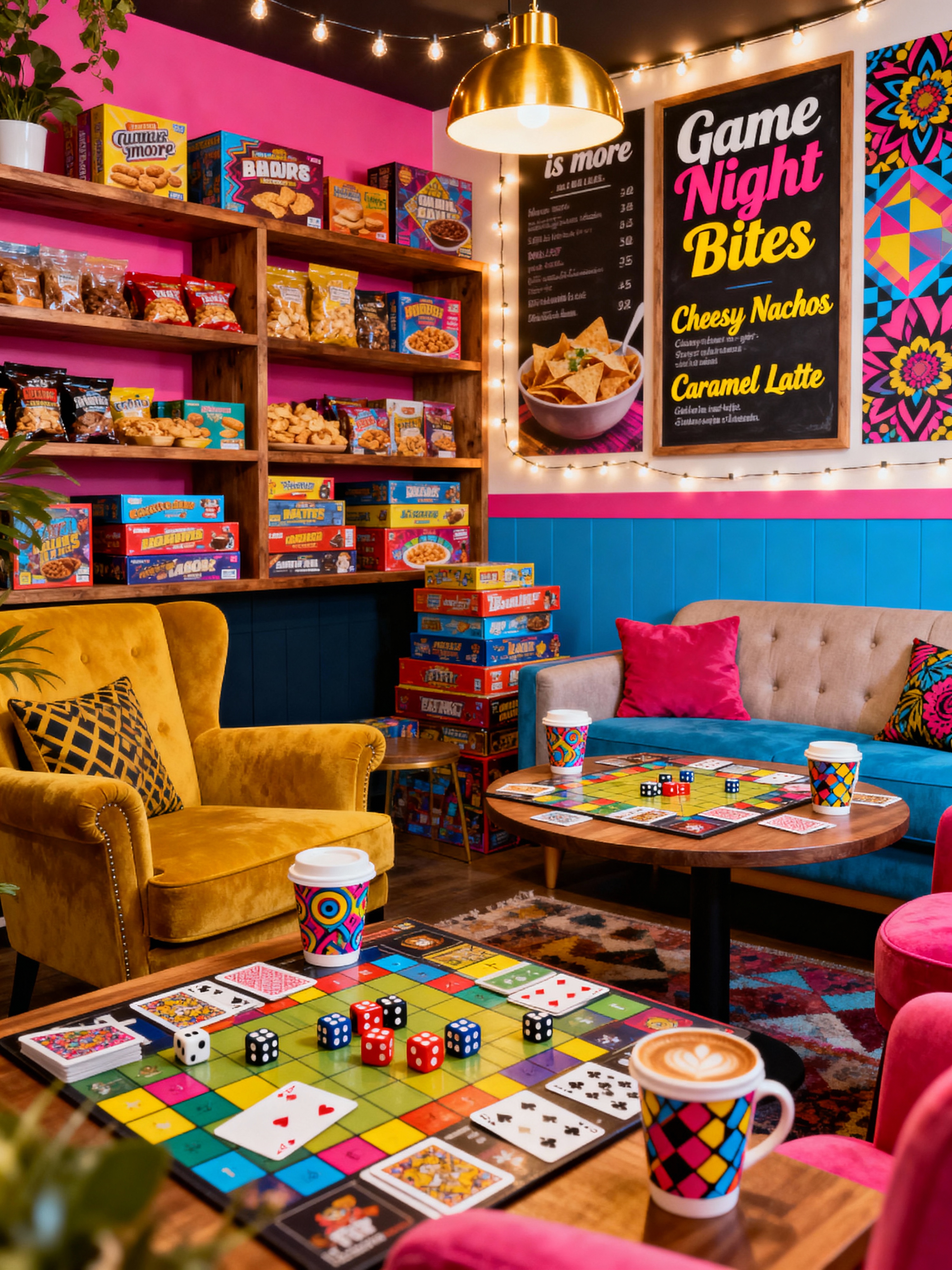 board game cafe with maximalist style with comfortable chairs and snacks and board games and menu boards and coffee cups and playing cards and dice and cozy lighting. . with over-the-top aesthetic and bold design and playful and bold colors and bold patterns and more is more philosophy and vibrant and eye-catching