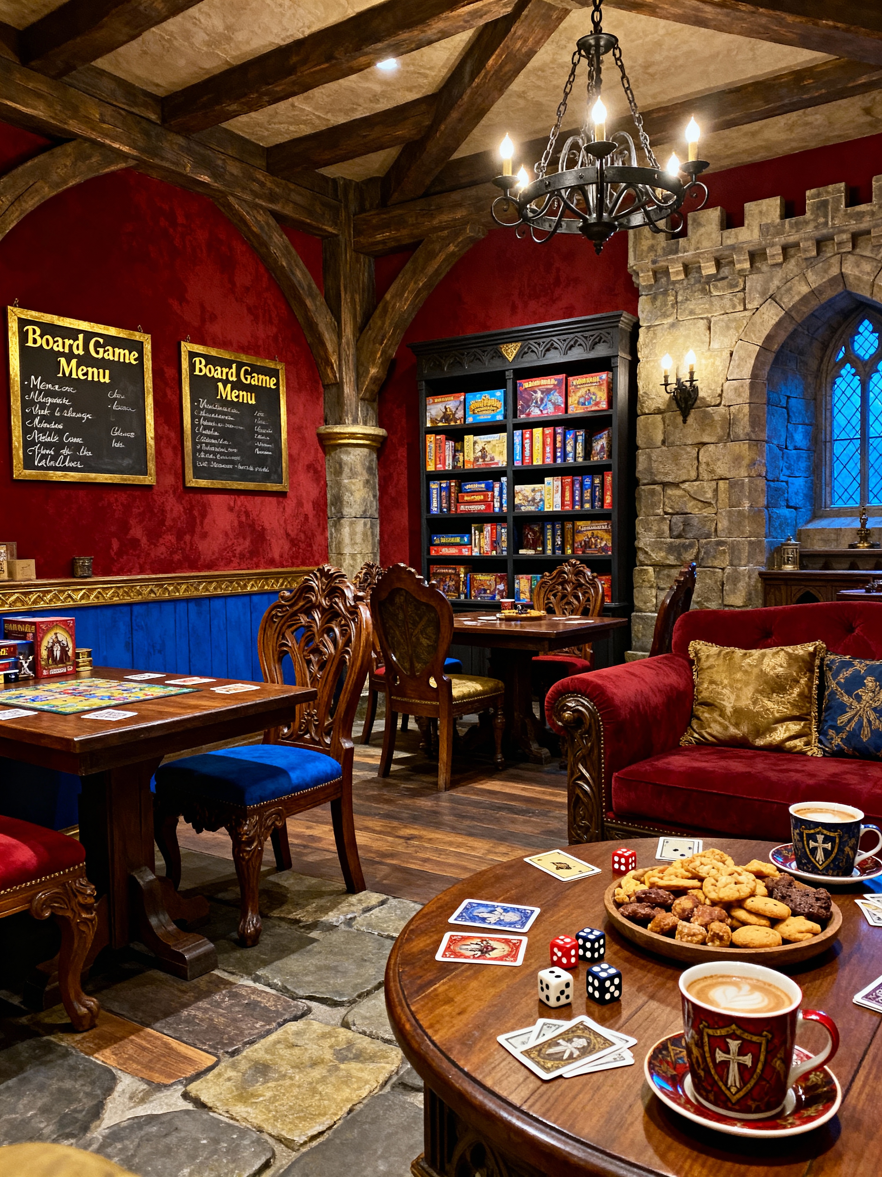 board game cafe with medieval style with snacks and comfortable chairs and menu boards and coffee cups and dice and game shelves and board games and playing cards. . with carved wooden chairs and deep colors like red, gold, or blue and stone or wooden floor and heavy furniture pieces and timber beams and castle interior and castle interior and castle interior
