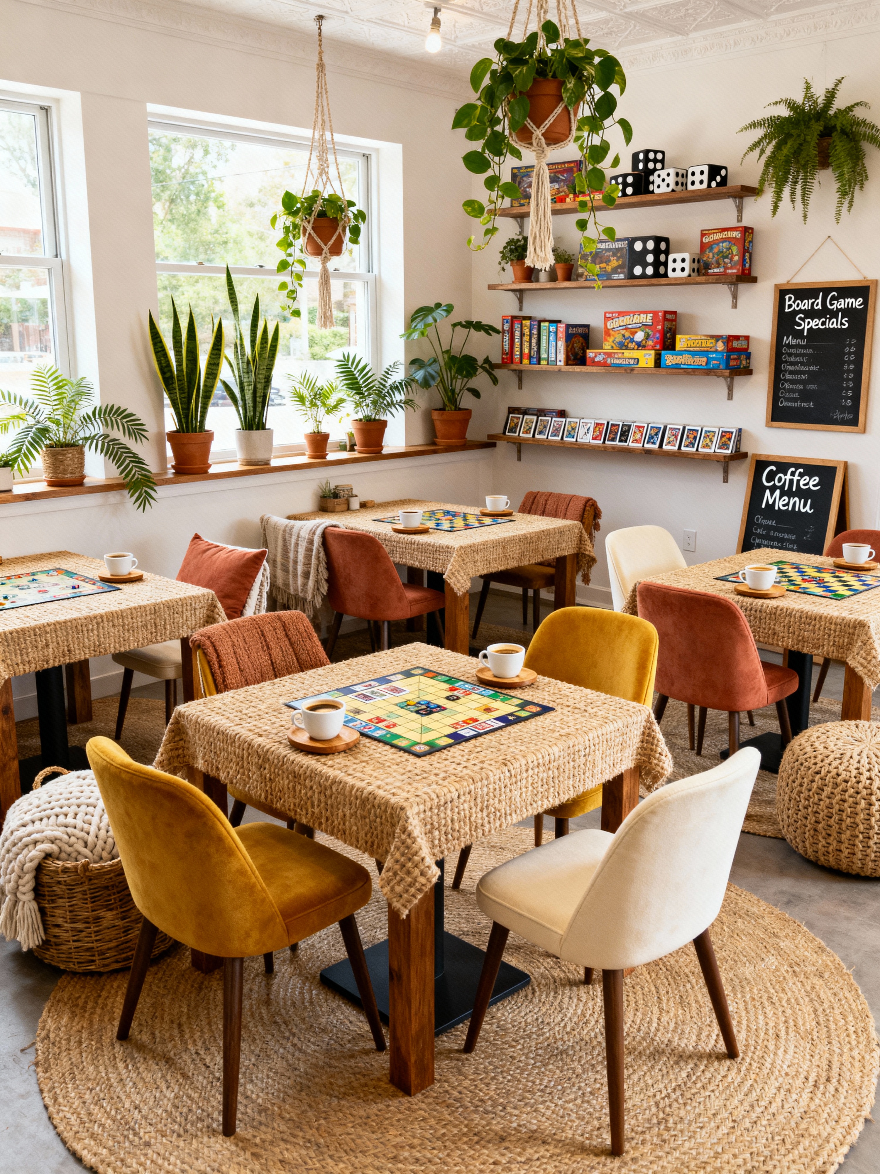 board game cafe with modern boho style with dice and board games and coffee cups and comfortable chairs and playing cards and game tables and menu boards and game shelves. . with potted plants and airy space and natural materials and woven textures and warm colors and layered textures and hanging plants and comfortable
