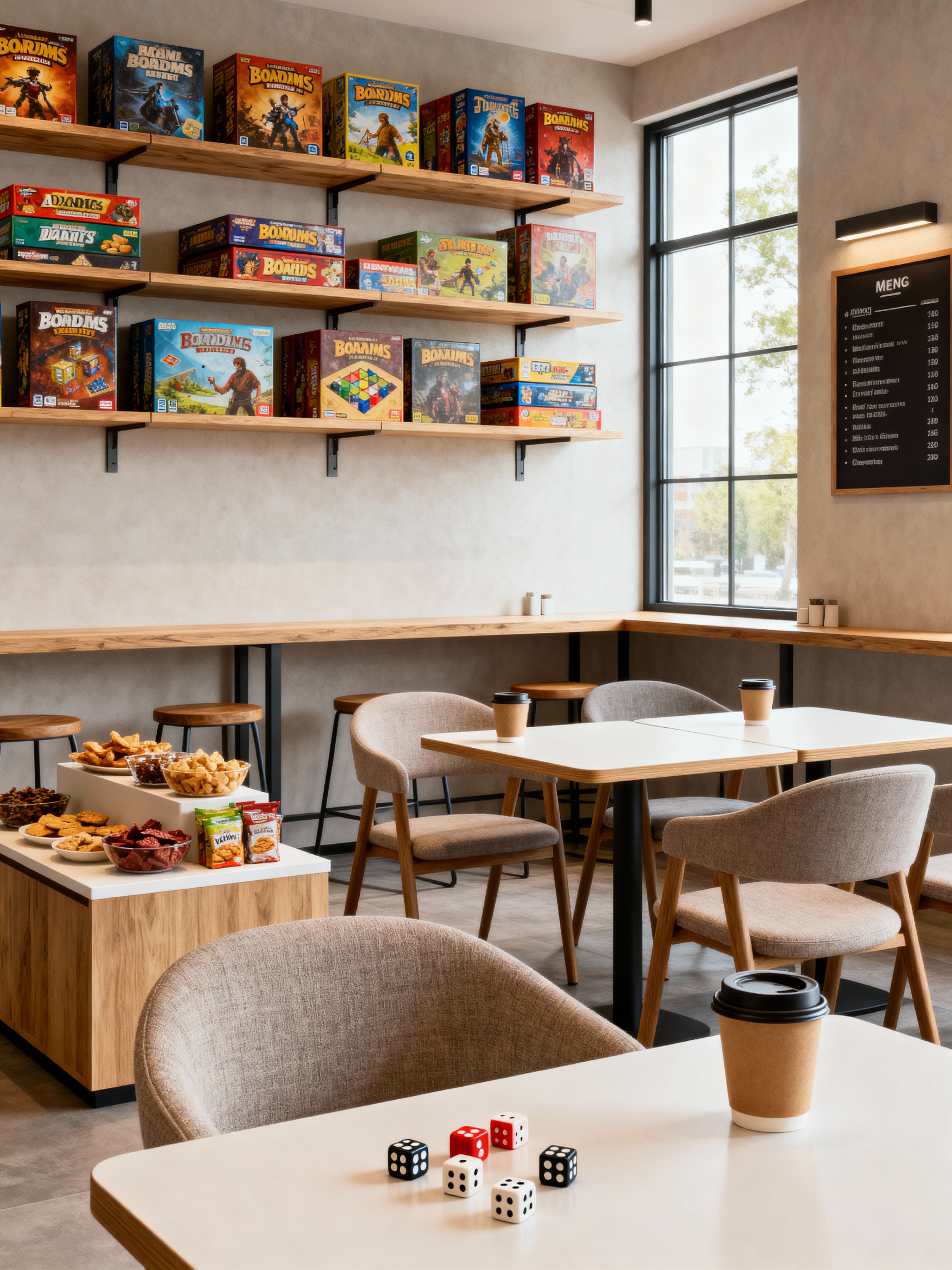 board game cafe with modern style with snacks and board games and comfortable chairs and game shelves and dice and menu boards and coffee cups and game tables. . with simple, clean lines and simplistic furniture and neutral walls and textures and open and natural lighting and practicality and functionality and natural materials and elements and simple, clean lines and simplistic furniture