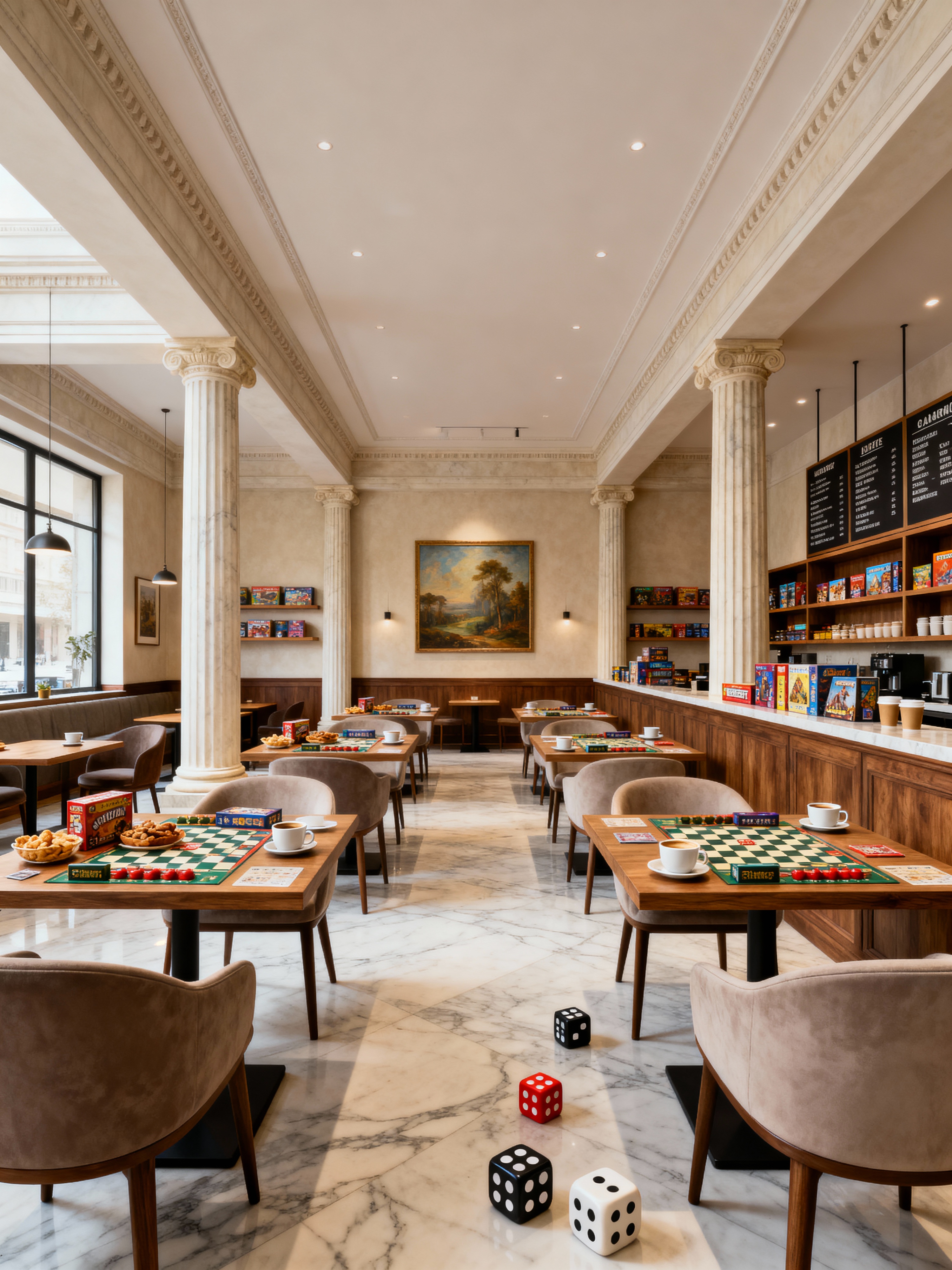 board game cafe with neoclassic style with game tables and comfortable chairs and snacks and menu boards and dice and board games and coffee cups and game shelves. . with symmetric layouts and timeless artwork and spacious rooms and emphasized horizontal and vertical lines and greek columns and timeless furniture and thoughtful minimalism and high ceilings