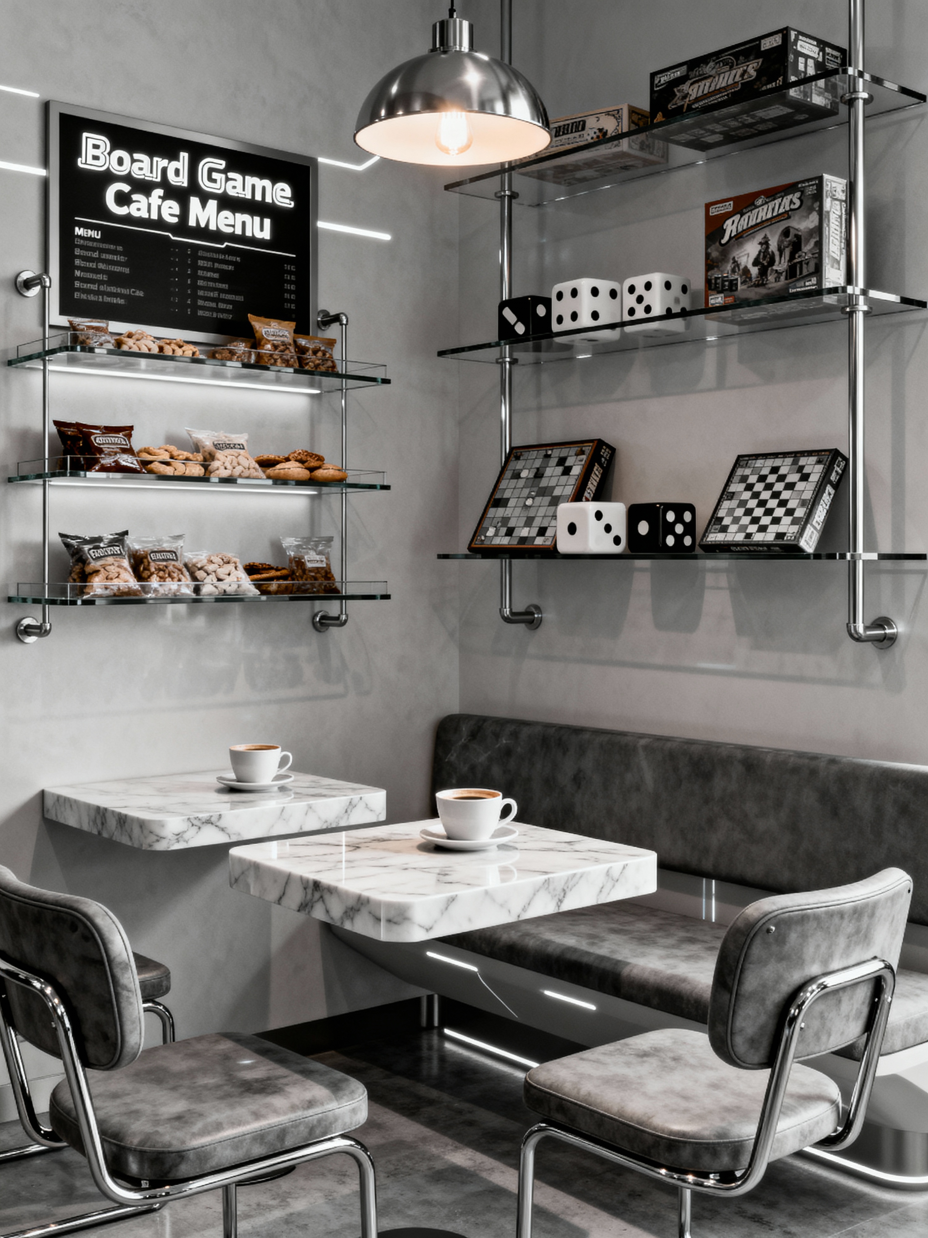 board game cafe with retro futuristic style with coffee cups and cozy lighting and comfortable chairs and snacks and menu boards and dice and board games and game shelves. . with minimalist clean lines and vintage futurism and futurism minimalist interior and steel finishing and floating surfaces and smooth polished marble and futuristic interior and monochromatic palette