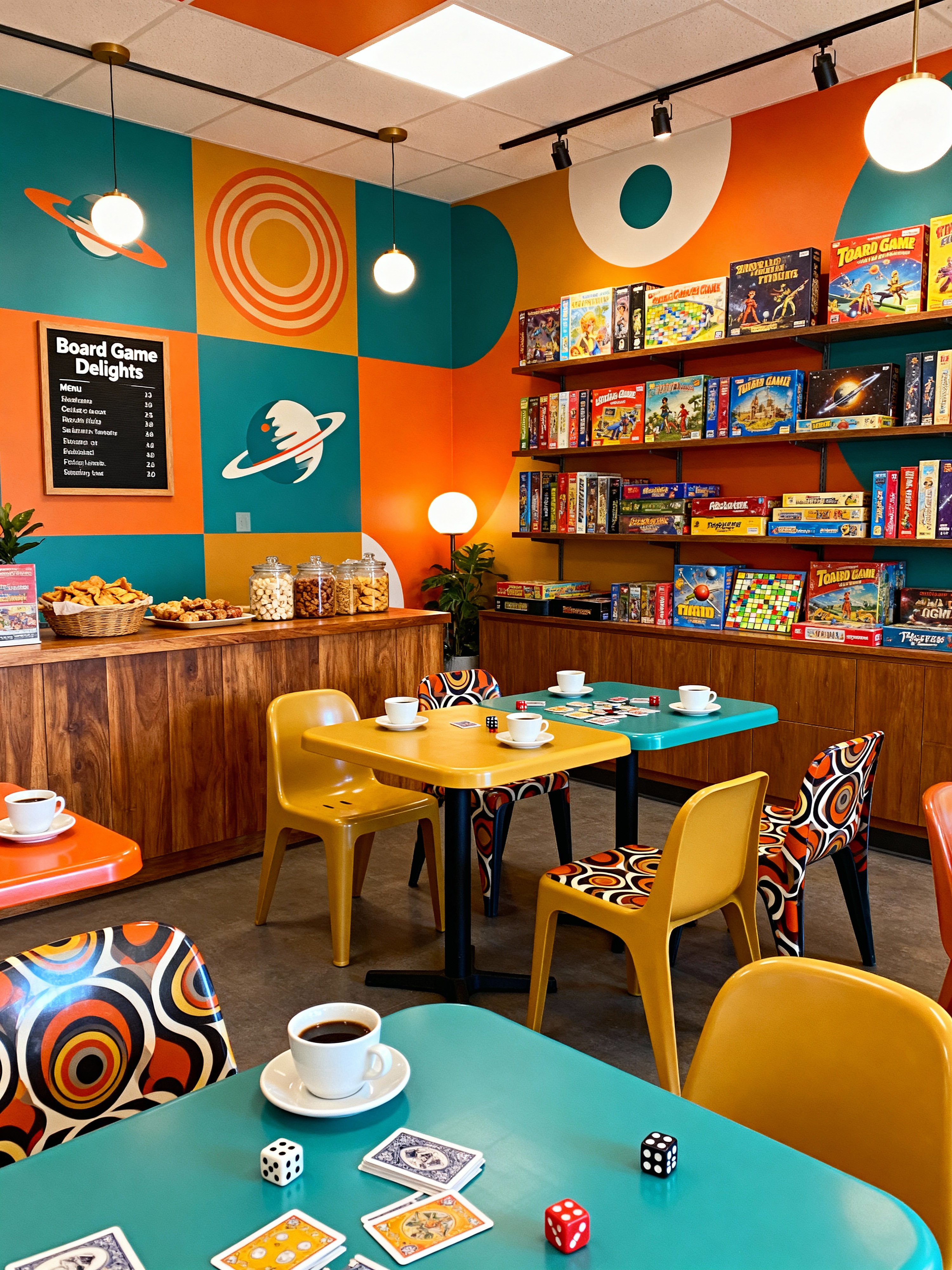 board game cafe with retro style with snacks and game shelves and coffee cups and dice and playing cards and menu boards and cozy lighting and comfortable chairs. . with mod style and nostalgic pieces and groovy vibes and plastic furniture and bold patterns and space age and bright colors and geometric shapes