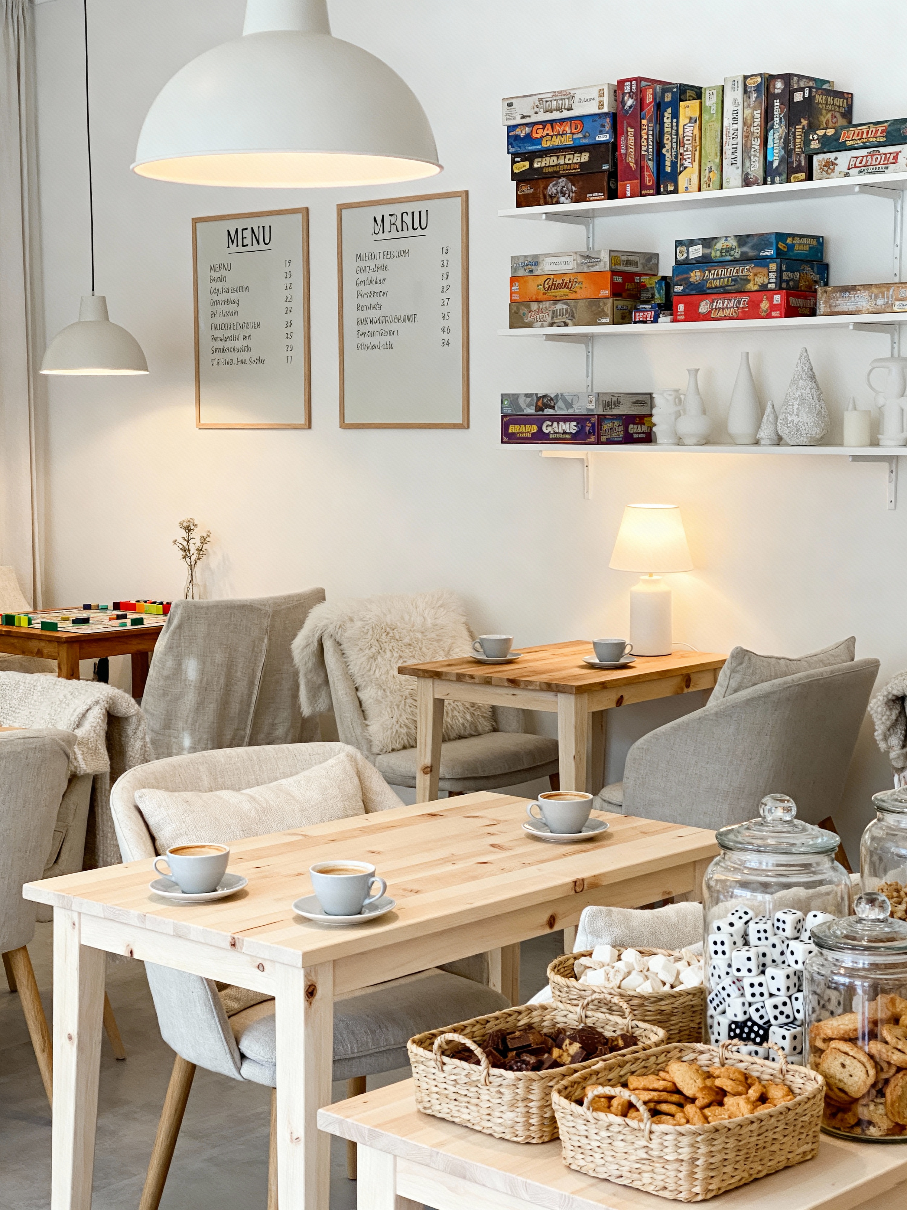 board game cafe with scandinavian style with coffee cups and cozy lighting and menu boards and game shelves and dice and snacks and game tables and comfortable chairs. . with neutral palette and simple elegance and light wood and textured fabrics and white decor and hygge and clean lines and cozy atmosphere