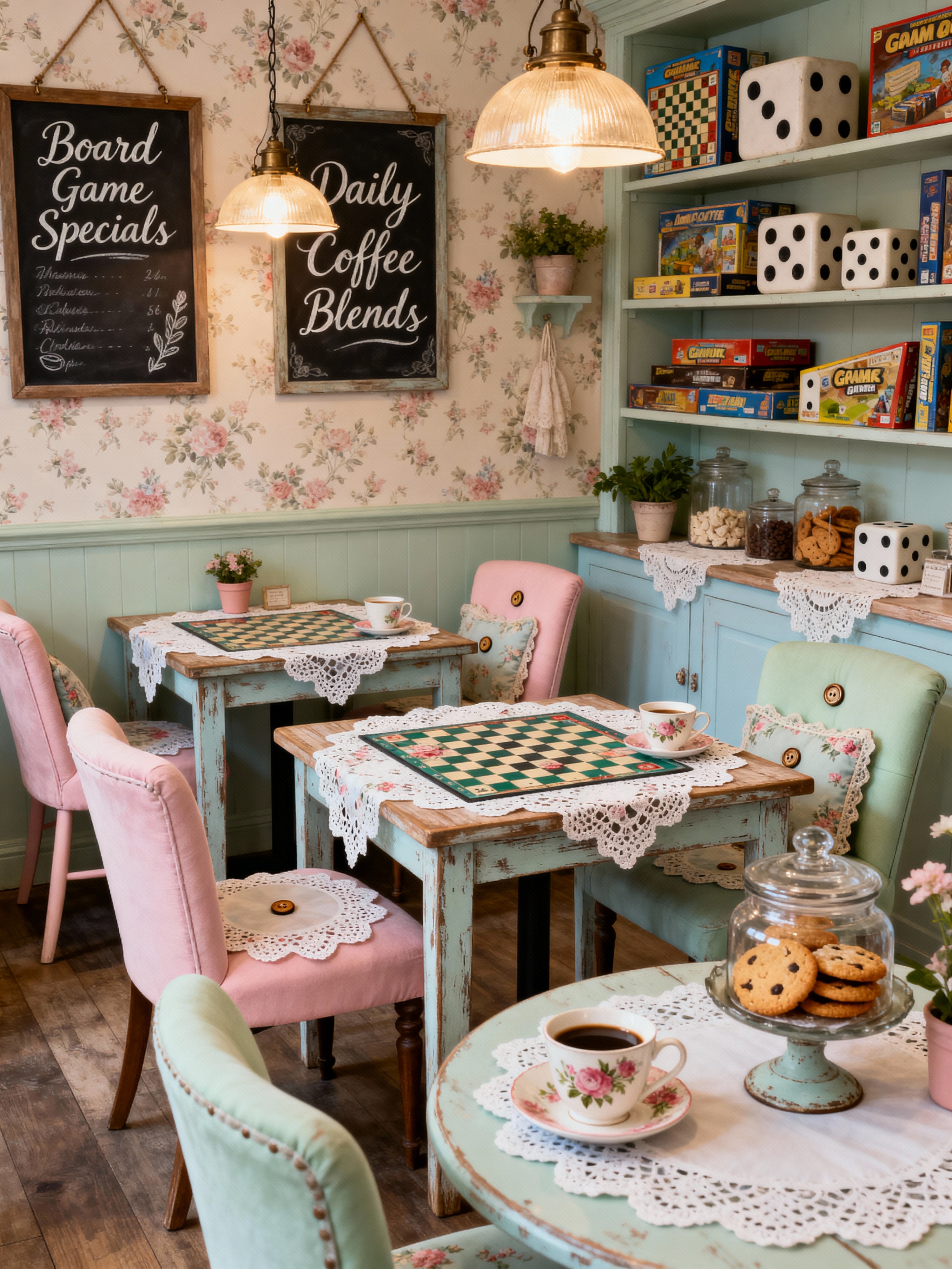 board game cafe with shabby chic style with dice and snacks and game tables and coffee cups and menu boards and board games and cozy lighting and comfortable chairs. . with vintage charm and floral patterns and distressed furniture and pastel colors and delicate details and feminine touches and antique lace and cottage feel