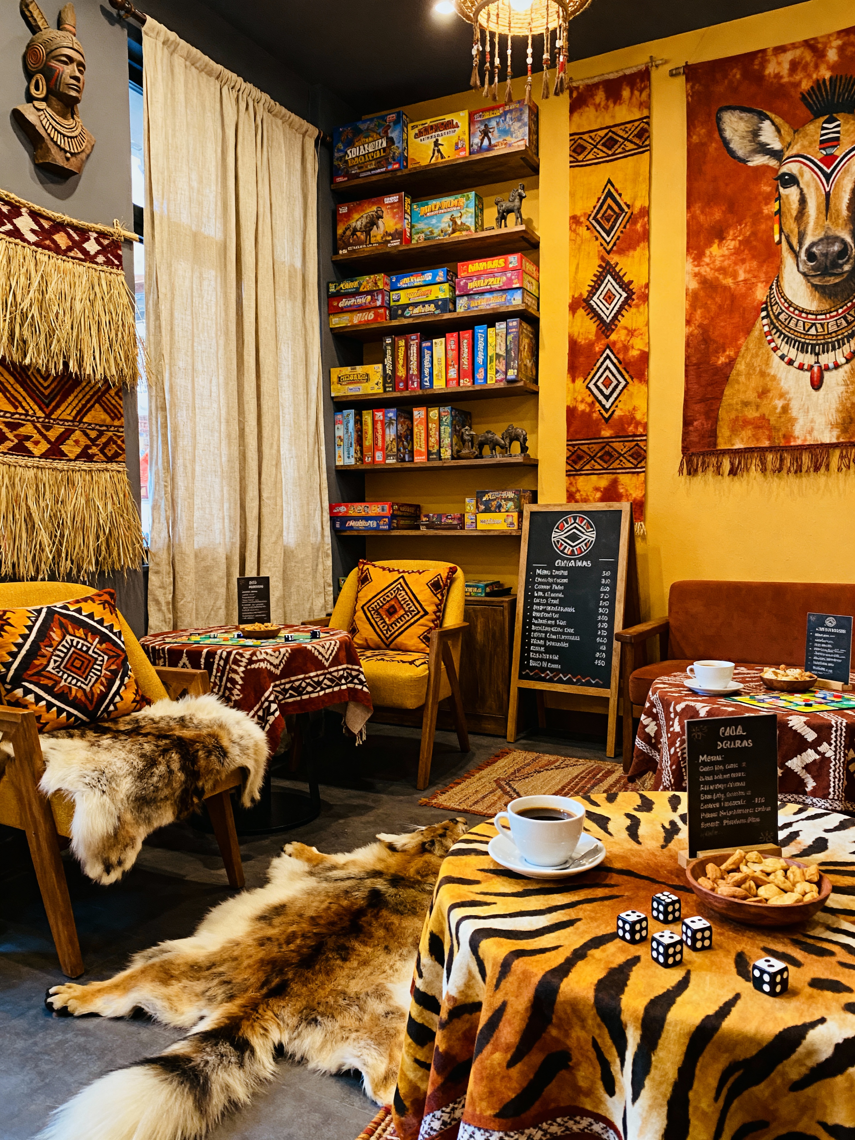 board game cafe with tribal style with board games and comfortable chairs and menu boards and game shelves and coffee cups and snacks and dice and game tables. . with exuberant splashes of colour and hand dyed batik fabrics and desert colours and intricate grass weaving and animal furslinen and sculptures and artworks and tribal patterns and animal prints