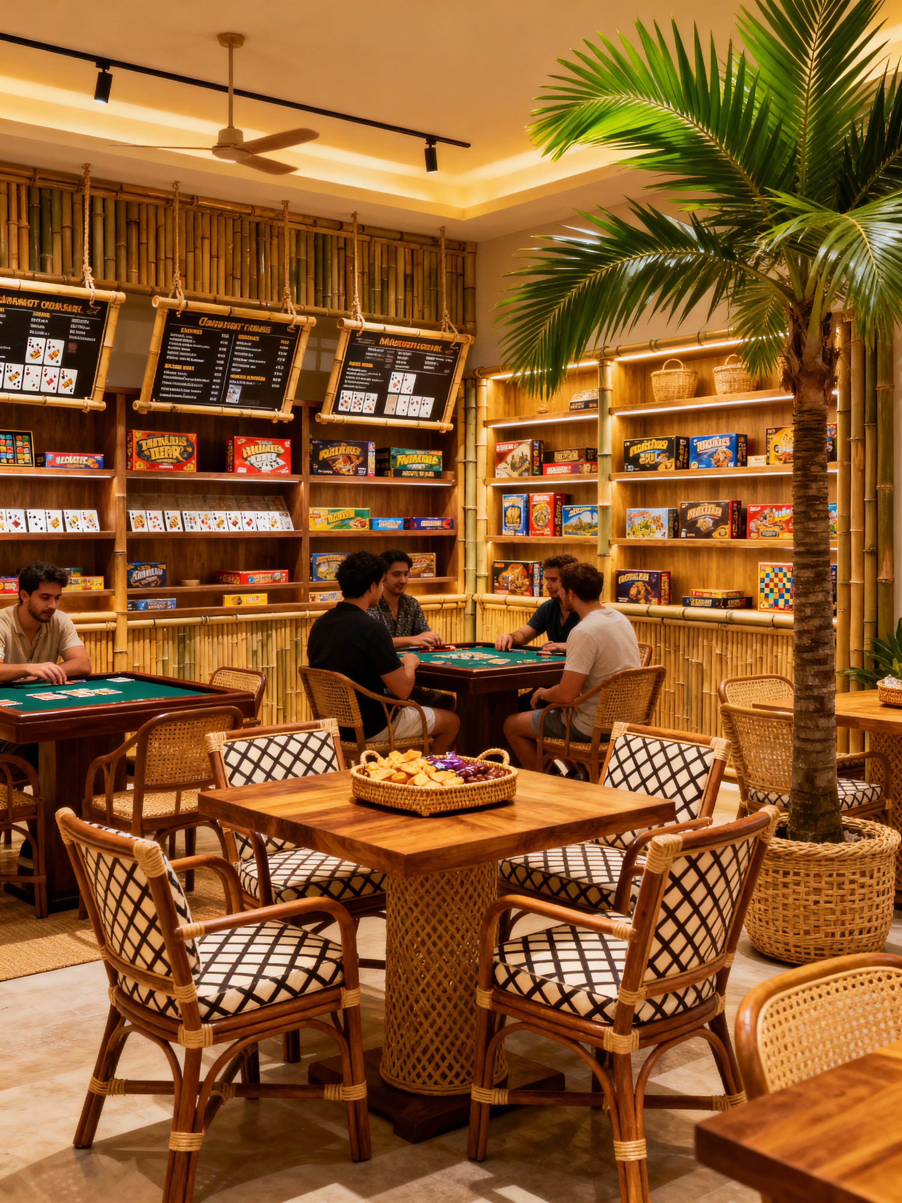 board game cafe with tropical style with playing cards and board games and menu boards and game tables and cozy lighting and game shelves and snacks and comfortable chairs. . with lattice prints and palm leaves and wicker and bamboo and palm trees and rattan and cane motifs and teak