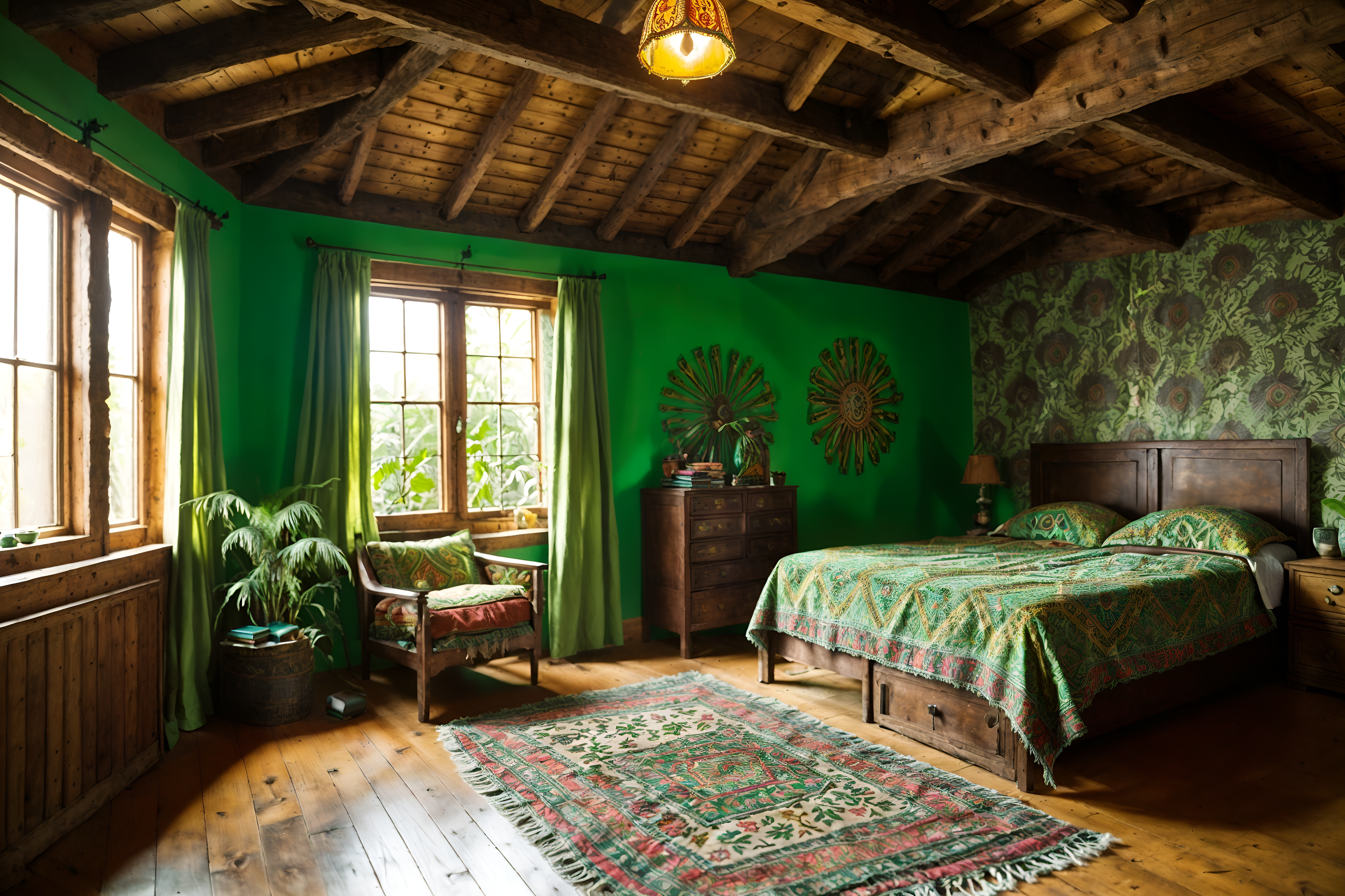 photo from pinterest of bohemian-style interior designed (attic interior) . with carefree layers of pattern, texture, and color and lush green nature and bold colors and a lack of structure and woods and playful colors and playful textures and playful patterns. . cinematic photo, highly detailed, cinematic lighting, ultra-detailed, ultrarealistic, photorealism, 8k. trending on pinterest. bohemian interior design style. masterpiece, cinematic light, ultrarealistic+, photorealistic+, 8k, raw photo, realistic, sharp focus on eyes, (symmetrical eyes), (intact eyes), hyperrealistic, highest quality, best quality, , highly detailed, masterpiece, best quality, extremely detailed 8k wallpaper, masterpiece, best quality, ultra-detailed, best shadow, detailed background, detailed face, detailed eyes, high contrast, best illumination, detailed face, dulux, caustic, dynamic angle, detailed glow. dramatic lighting. highly detailed, insanely detailed hair, symmetrical, intricate details, professionally retouched, 8k high definition. strong bokeh. award winning photo.
