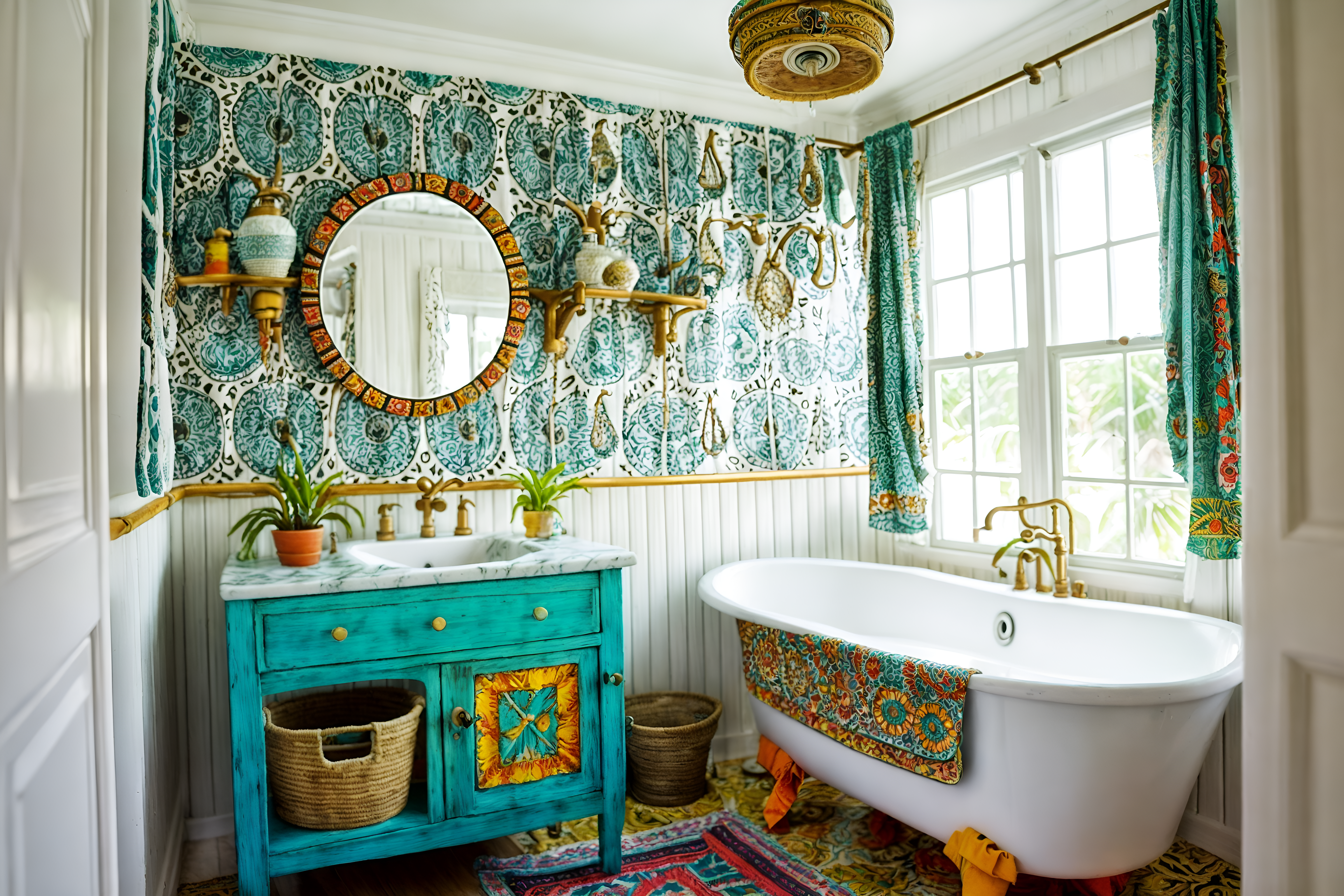 photo from pinterest of bohemian-style interior designed (bathroom interior) with bathtub and bathroom sink with faucet and bathroom cabinet and plant and waste basket and shower and toilet seat and bath rail. . with bold colors and mixed patterns and playful textures and carefree layers of pattern, texture, and color and travel trinkets and natural materials and animal hides and bold patterns. . cinematic photo, highly detailed, cinematic lighting, ultra-detailed, ultrarealistic, photorealism, 8k. trending on pinterest. bohemian interior design style. masterpiece, cinematic light, ultrarealistic+, photorealistic+, 8k, raw photo, realistic, sharp focus on eyes, (symmetrical eyes), (intact eyes), hyperrealistic, highest quality, best quality, , highly detailed, masterpiece, best quality, extremely detailed 8k wallpaper, masterpiece, best quality, ultra-detailed, best shadow, detailed background, detailed face, detailed eyes, high contrast, best illumination, detailed face, dulux, caustic, dynamic angle, detailed glow. dramatic lighting. highly detailed, insanely detailed hair, symmetrical, intricate details, professionally retouched, 8k high definition. strong bokeh. award winning photo.