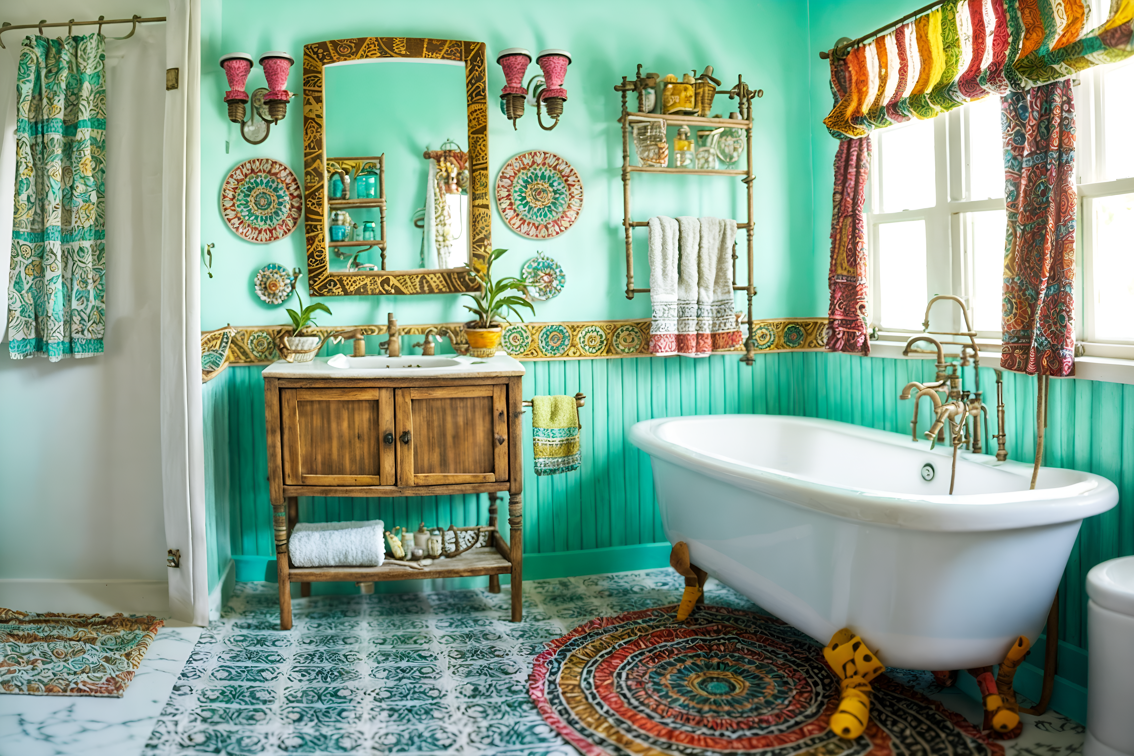 photo from pinterest of bohemian-style interior designed (bathroom interior) with bathtub and bathroom sink with faucet and bathroom cabinet and plant and waste basket and shower and toilet seat and bath rail. . with bold colors and mixed patterns and playful textures and carefree layers of pattern, texture, and color and travel trinkets and natural materials and animal hides and bold patterns. . cinematic photo, highly detailed, cinematic lighting, ultra-detailed, ultrarealistic, photorealism, 8k. trending on pinterest. bohemian interior design style. masterpiece, cinematic light, ultrarealistic+, photorealistic+, 8k, raw photo, realistic, sharp focus on eyes, (symmetrical eyes), (intact eyes), hyperrealistic, highest quality, best quality, , highly detailed, masterpiece, best quality, extremely detailed 8k wallpaper, masterpiece, best quality, ultra-detailed, best shadow, detailed background, detailed face, detailed eyes, high contrast, best illumination, detailed face, dulux, caustic, dynamic angle, detailed glow. dramatic lighting. highly detailed, insanely detailed hair, symmetrical, intricate details, professionally retouched, 8k high definition. strong bokeh. award winning photo.