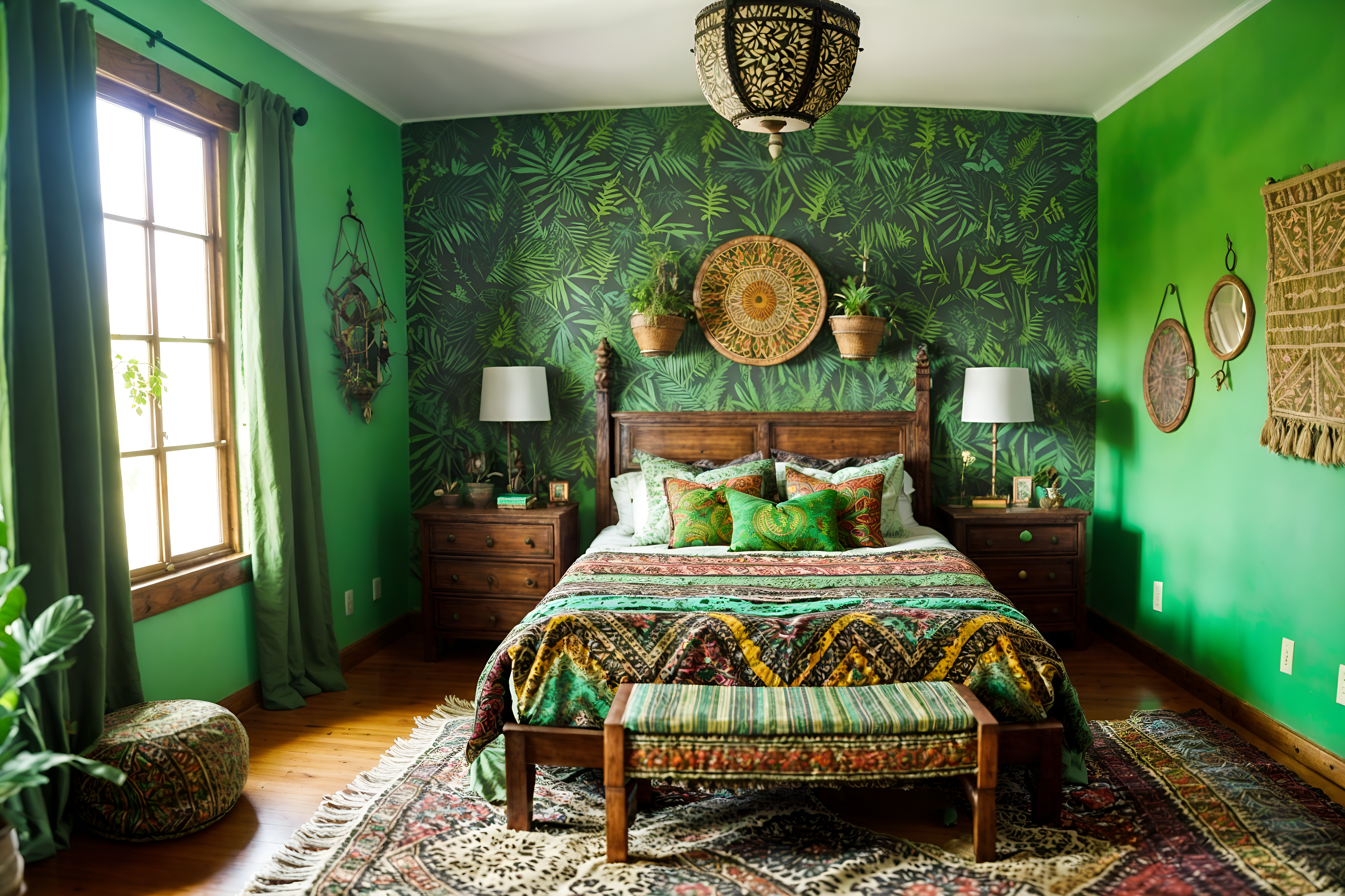 photo from pinterest of bohemian-style interior designed (bedroom interior) with plant and storage bench or ottoman and bed and dresser closet and headboard and accent chair and bedside table or night stand and night light. . with woods and playful colors and a lack of structure and lush green nature and bold patterns and natural materials and mixed patterns and carefree layers of pattern, texture, and color. . cinematic photo, highly detailed, cinematic lighting, ultra-detailed, ultrarealistic, photorealism, 8k. trending on pinterest. bohemian interior design style. masterpiece, cinematic light, ultrarealistic+, photorealistic+, 8k, raw photo, realistic, sharp focus on eyes, (symmetrical eyes), (intact eyes), hyperrealistic, highest quality, best quality, , highly detailed, masterpiece, best quality, extremely detailed 8k wallpaper, masterpiece, best quality, ultra-detailed, best shadow, detailed background, detailed face, detailed eyes, high contrast, best illumination, detailed face, dulux, caustic, dynamic angle, detailed glow. dramatic lighting. highly detailed, insanely detailed hair, symmetrical, intricate details, professionally retouched, 8k high definition. strong bokeh. award winning photo.