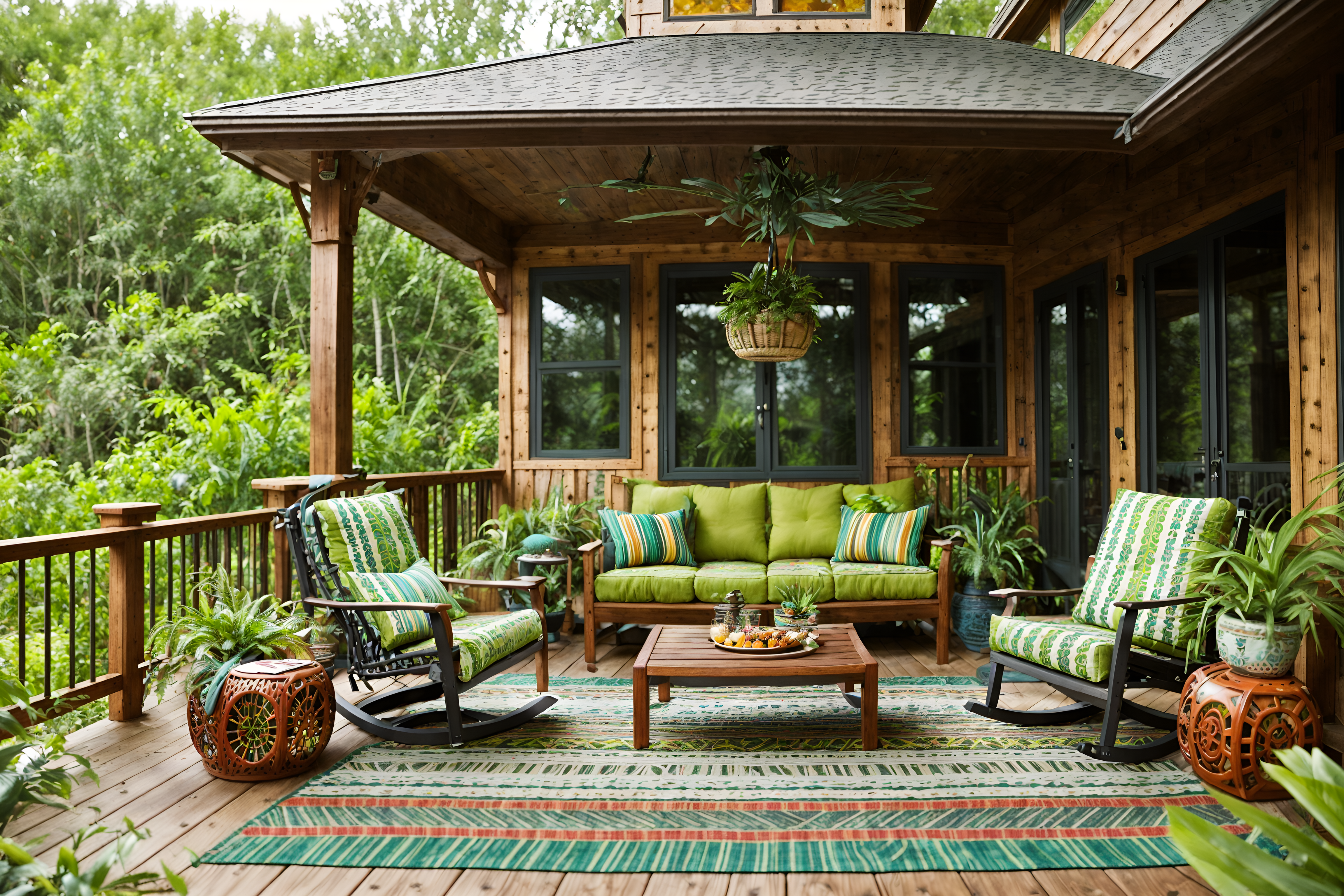 photo from pinterest of bohemian-style designed (outdoor patio ) with deck with deck chairs and barbeque or grill and patio couch with pillows and plant and grass and deck with deck chairs. . with travel trinkets and mixed patterns and playful textures and bold patterns and lush green nature and woods and carefree layers of pattern, texture, and color and bold colors. . cinematic photo, highly detailed, cinematic lighting, ultra-detailed, ultrarealistic, photorealism, 8k. trending on pinterest. bohemian design style. masterpiece, cinematic light, ultrarealistic+, photorealistic+, 8k, raw photo, realistic, sharp focus on eyes, (symmetrical eyes), (intact eyes), hyperrealistic, highest quality, best quality, , highly detailed, masterpiece, best quality, extremely detailed 8k wallpaper, masterpiece, best quality, ultra-detailed, best shadow, detailed background, detailed face, detailed eyes, high contrast, best illumination, detailed face, dulux, caustic, dynamic angle, detailed glow. dramatic lighting. highly detailed, insanely detailed hair, symmetrical, intricate details, professionally retouched, 8k high definition. strong bokeh. award winning photo.