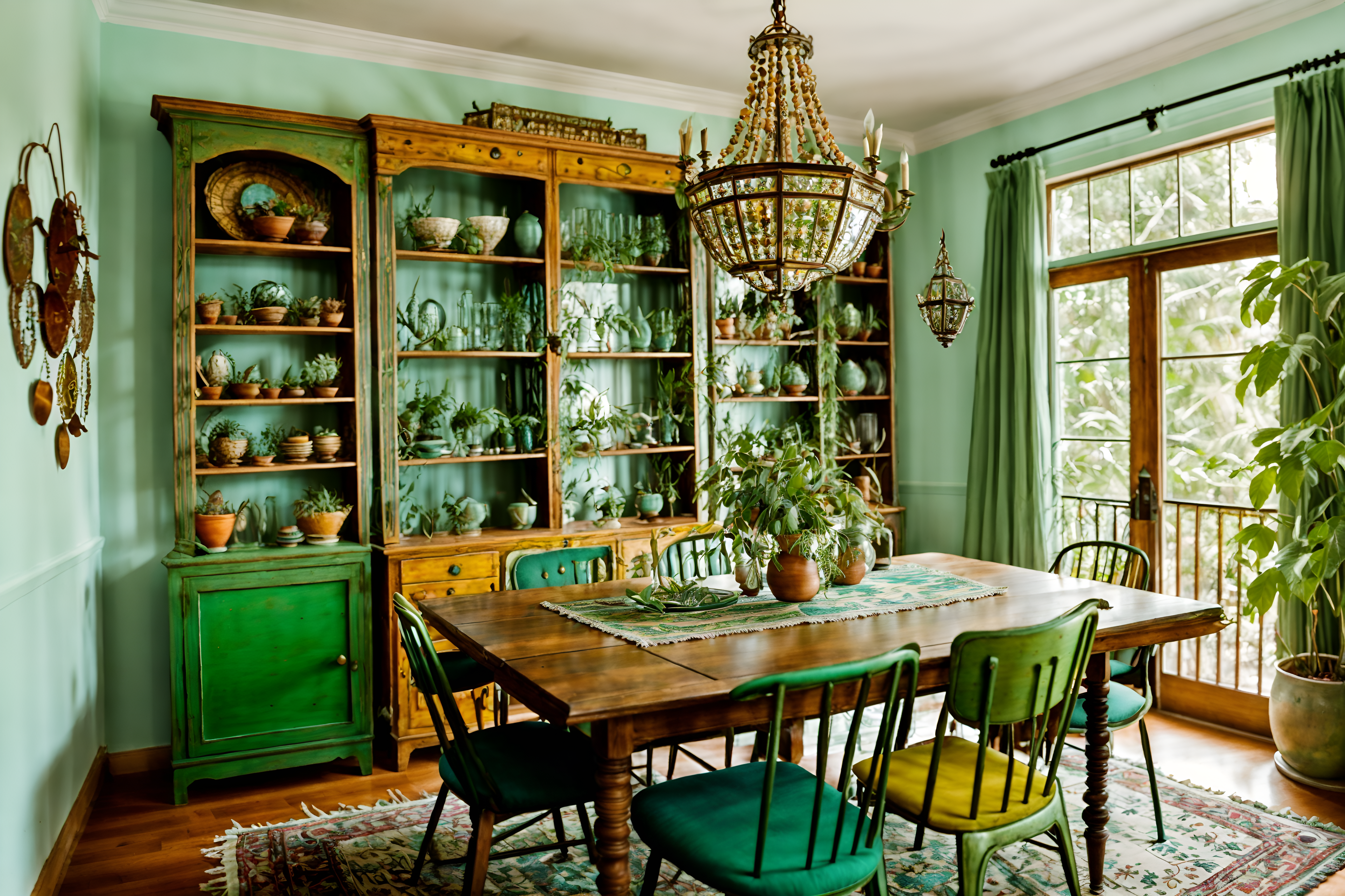 photo from pinterest of bohemian-style interior designed (dining room interior) with bookshelves and plates, cutlery and glasses on dining table and painting or photo on wall and plant and table cloth and light or chandelier and dining table and vase. . with woods and playful textures and playful colors and metals and travel trinkets and lush green nature and bold colors and natural materials. . cinematic photo, highly detailed, cinematic lighting, ultra-detailed, ultrarealistic, photorealism, 8k. trending on pinterest. bohemian interior design style. masterpiece, cinematic light, ultrarealistic+, photorealistic+, 8k, raw photo, realistic, sharp focus on eyes, (symmetrical eyes), (intact eyes), hyperrealistic, highest quality, best quality, , highly detailed, masterpiece, best quality, extremely detailed 8k wallpaper, masterpiece, best quality, ultra-detailed, best shadow, detailed background, detailed face, detailed eyes, high contrast, best illumination, detailed face, dulux, caustic, dynamic angle, detailed glow. dramatic lighting. highly detailed, insanely detailed hair, symmetrical, intricate details, professionally retouched, 8k high definition. strong bokeh. award winning photo.