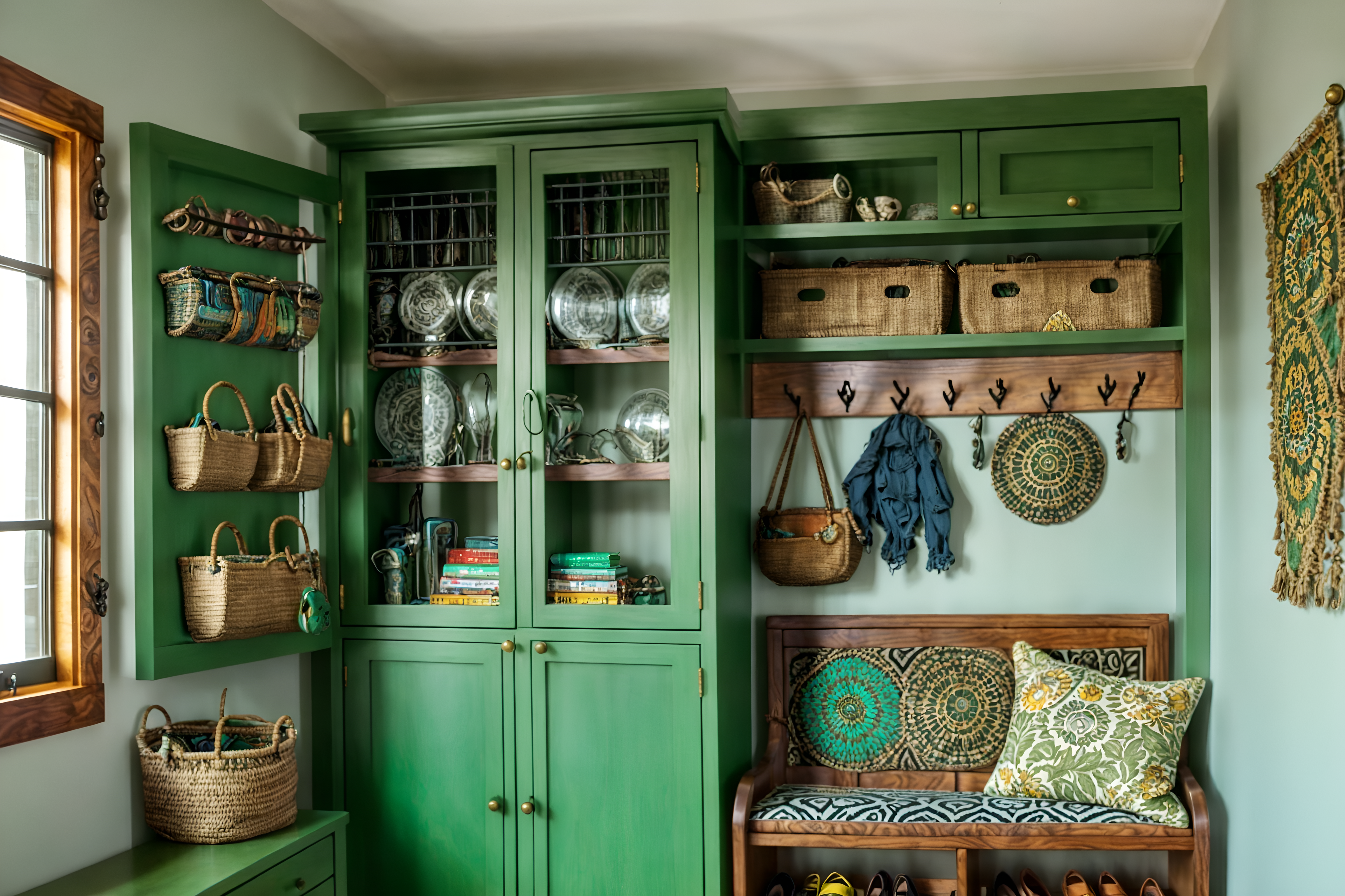 photo from pinterest of bohemian-style interior designed (drop zone interior) with wall hooks for coats and cubbies and storage drawers and high up storage and cabinets and storage baskets and shelves for shoes and a bench. . with playful textures and bold patterns and playful patterns and metals and a lack of structure and bold colors and travel trinkets and lush green nature. . cinematic photo, highly detailed, cinematic lighting, ultra-detailed, ultrarealistic, photorealism, 8k. trending on pinterest. bohemian interior design style. masterpiece, cinematic light, ultrarealistic+, photorealistic+, 8k, raw photo, realistic, sharp focus on eyes, (symmetrical eyes), (intact eyes), hyperrealistic, highest quality, best quality, , highly detailed, masterpiece, best quality, extremely detailed 8k wallpaper, masterpiece, best quality, ultra-detailed, best shadow, detailed background, detailed face, detailed eyes, high contrast, best illumination, detailed face, dulux, caustic, dynamic angle, detailed glow. dramatic lighting. highly detailed, insanely detailed hair, symmetrical, intricate details, professionally retouched, 8k high definition. strong bokeh. award winning photo.
