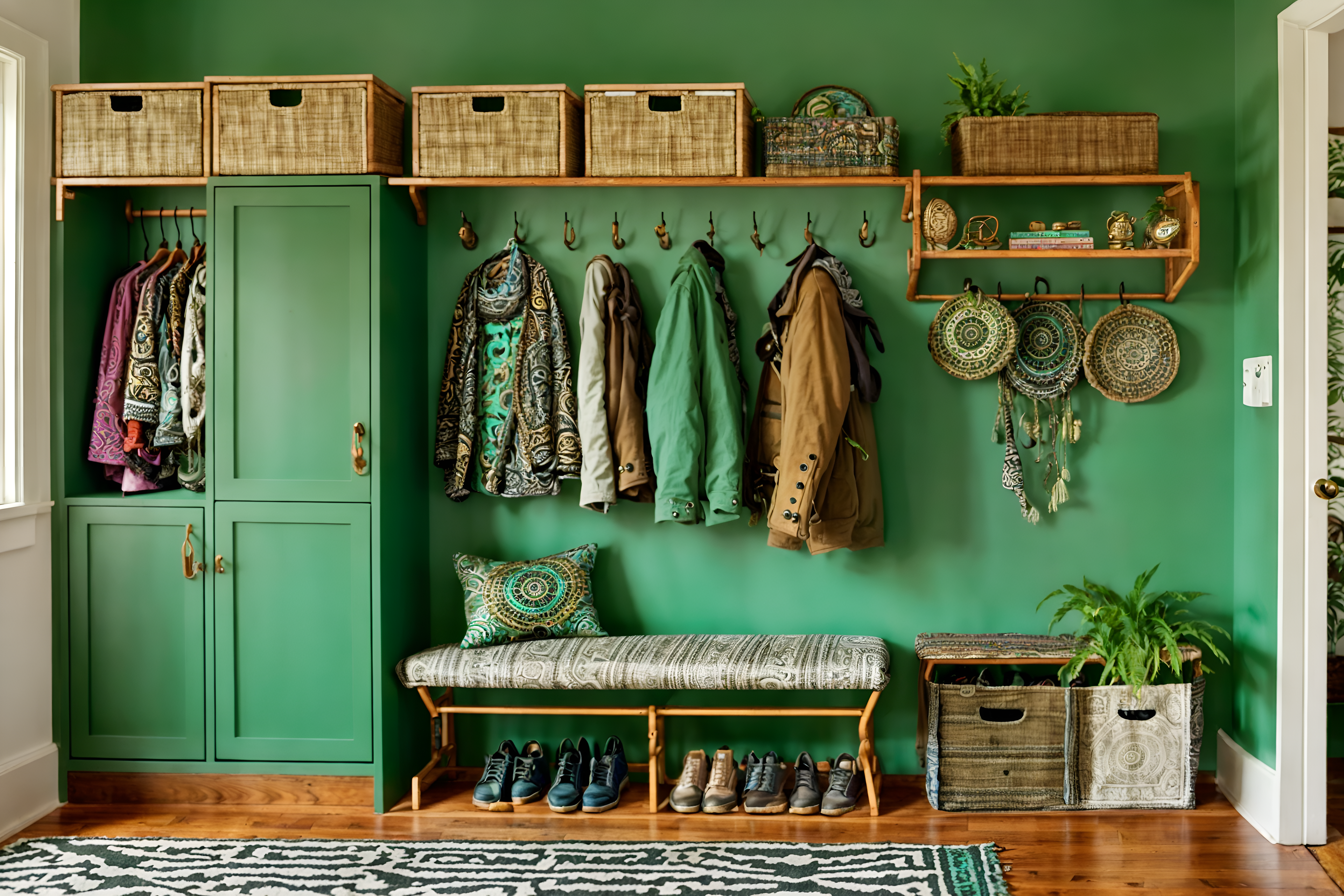 photo from pinterest of bohemian-style interior designed (drop zone interior) with wall hooks for coats and cubbies and storage drawers and high up storage and cabinets and storage baskets and shelves for shoes and a bench. . with playful textures and bold patterns and playful patterns and metals and a lack of structure and bold colors and travel trinkets and lush green nature. . cinematic photo, highly detailed, cinematic lighting, ultra-detailed, ultrarealistic, photorealism, 8k. trending on pinterest. bohemian interior design style. masterpiece, cinematic light, ultrarealistic+, photorealistic+, 8k, raw photo, realistic, sharp focus on eyes, (symmetrical eyes), (intact eyes), hyperrealistic, highest quality, best quality, , highly detailed, masterpiece, best quality, extremely detailed 8k wallpaper, masterpiece, best quality, ultra-detailed, best shadow, detailed background, detailed face, detailed eyes, high contrast, best illumination, detailed face, dulux, caustic, dynamic angle, detailed glow. dramatic lighting. highly detailed, insanely detailed hair, symmetrical, intricate details, professionally retouched, 8k high definition. strong bokeh. award winning photo.