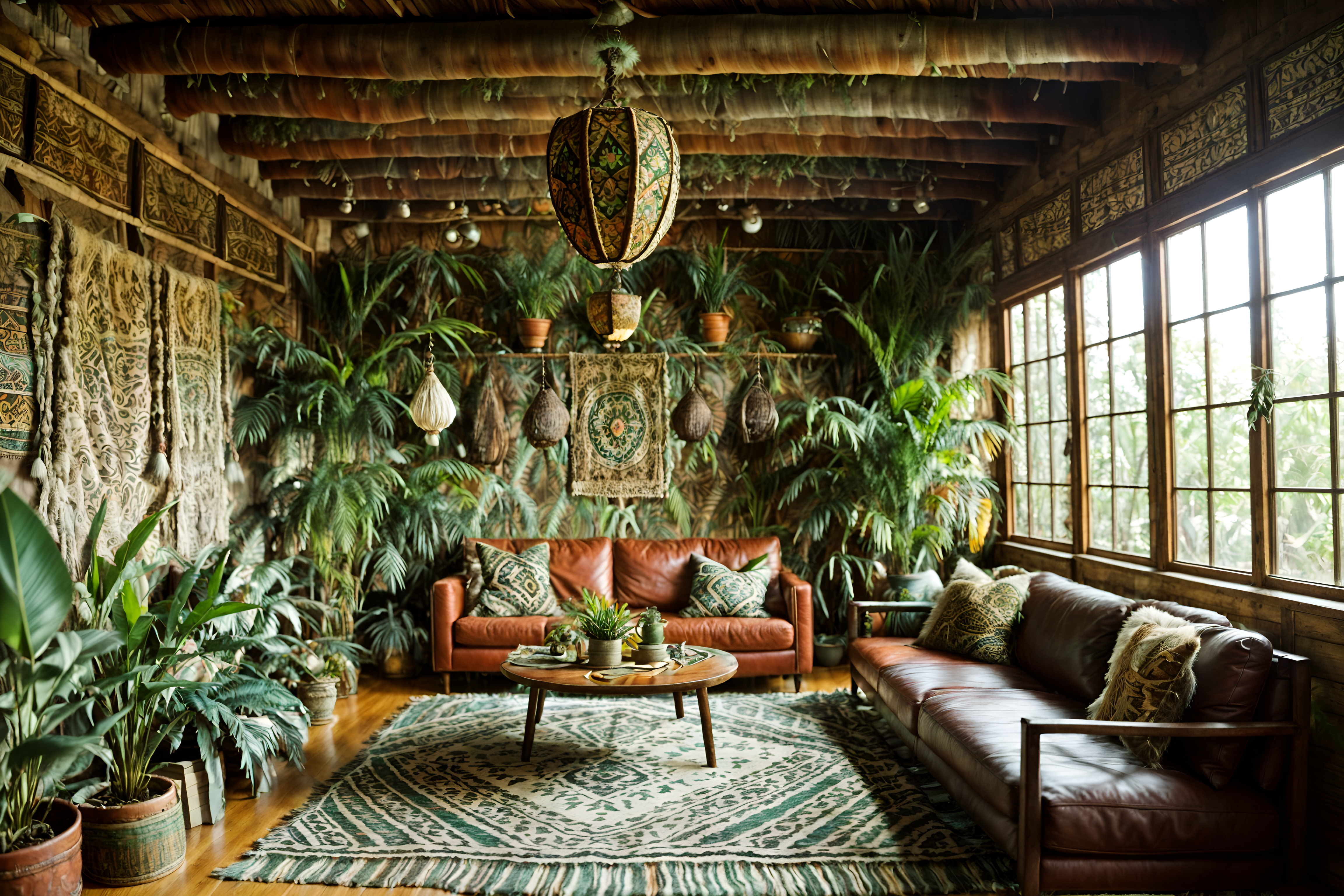 photo from pinterest of bohemian-style interior designed (exhibition space interior) . with animal hides and mixed patterns and playful textures and natural materials and lush green nature and woods and playful colors and carefree layers of pattern, texture, and color. . cinematic photo, highly detailed, cinematic lighting, ultra-detailed, ultrarealistic, photorealism, 8k. trending on pinterest. bohemian interior design style. masterpiece, cinematic light, ultrarealistic+, photorealistic+, 8k, raw photo, realistic, sharp focus on eyes, (symmetrical eyes), (intact eyes), hyperrealistic, highest quality, best quality, , highly detailed, masterpiece, best quality, extremely detailed 8k wallpaper, masterpiece, best quality, ultra-detailed, best shadow, detailed background, detailed face, detailed eyes, high contrast, best illumination, detailed face, dulux, caustic, dynamic angle, detailed glow. dramatic lighting. highly detailed, insanely detailed hair, symmetrical, intricate details, professionally retouched, 8k high definition. strong bokeh. award winning photo.