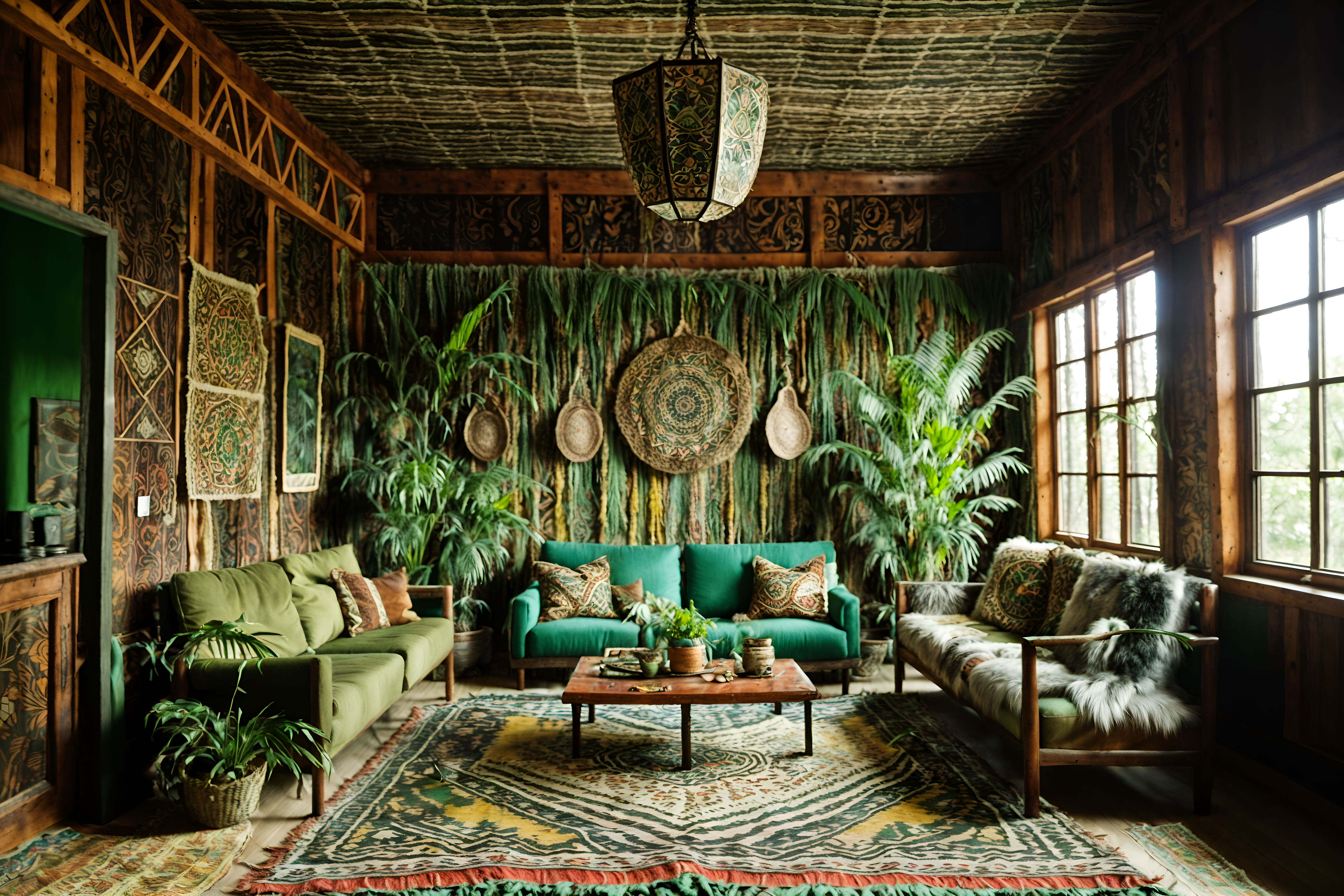 photo from pinterest of bohemian-style interior designed (exhibition space interior) . with animal hides and mixed patterns and playful textures and natural materials and lush green nature and woods and playful colors and carefree layers of pattern, texture, and color. . cinematic photo, highly detailed, cinematic lighting, ultra-detailed, ultrarealistic, photorealism, 8k. trending on pinterest. bohemian interior design style. masterpiece, cinematic light, ultrarealistic+, photorealistic+, 8k, raw photo, realistic, sharp focus on eyes, (symmetrical eyes), (intact eyes), hyperrealistic, highest quality, best quality, , highly detailed, masterpiece, best quality, extremely detailed 8k wallpaper, masterpiece, best quality, ultra-detailed, best shadow, detailed background, detailed face, detailed eyes, high contrast, best illumination, detailed face, dulux, caustic, dynamic angle, detailed glow. dramatic lighting. highly detailed, insanely detailed hair, symmetrical, intricate details, professionally retouched, 8k high definition. strong bokeh. award winning photo.