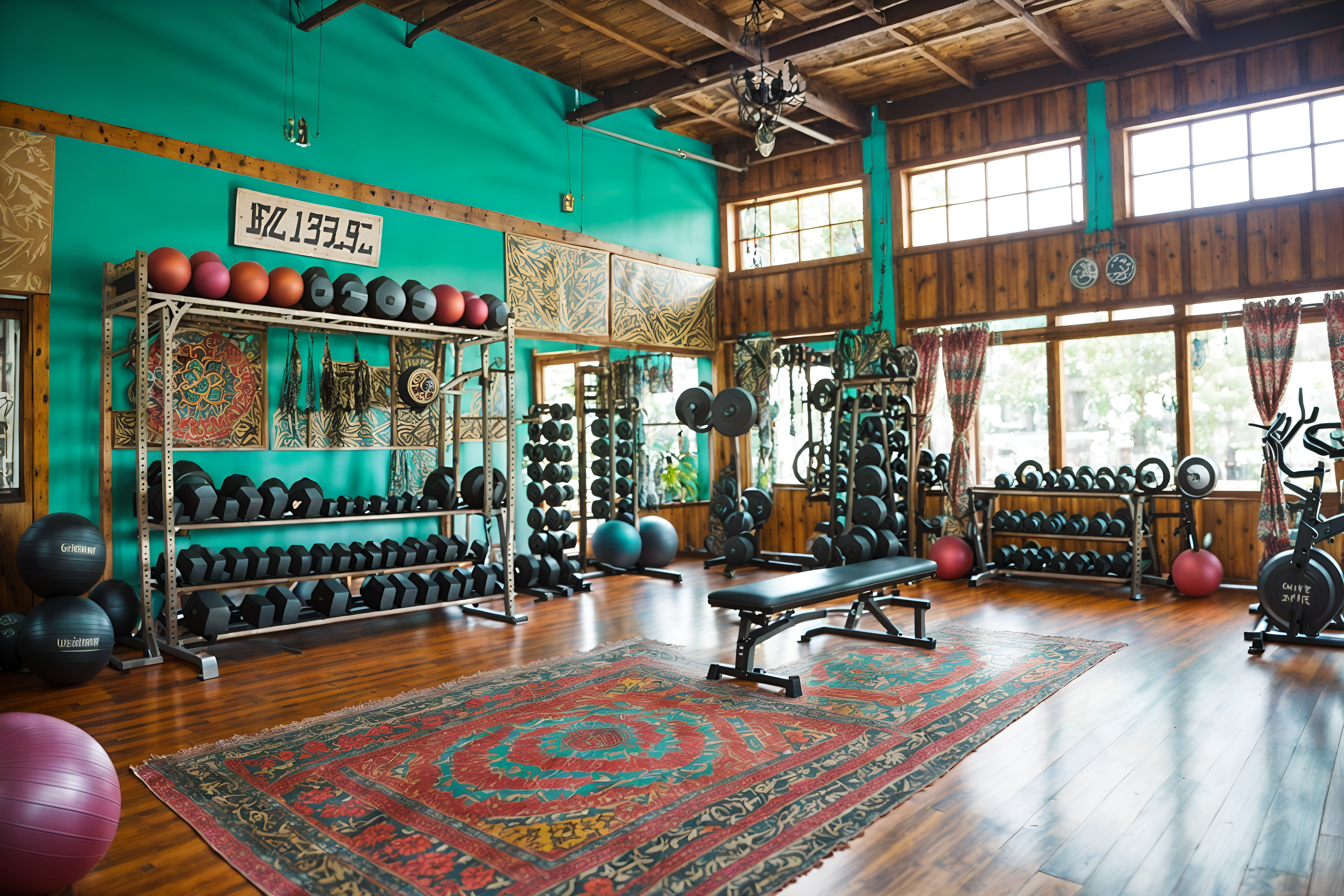 photo from pinterest of bohemian-style interior designed (fitness gym interior) with squat rack and exercise bicycle and crosstrainer and bench press and dumbbell stand and squat rack. . with carefree layers of pattern, texture, and color and metals and playful colors and bold colors and a lack of structure and woods and travel trinkets and bold patterns. . cinematic photo, highly detailed, cinematic lighting, ultra-detailed, ultrarealistic, photorealism, 8k. trending on pinterest. bohemian interior design style. masterpiece, cinematic light, ultrarealistic+, photorealistic+, 8k, raw photo, realistic, sharp focus on eyes, (symmetrical eyes), (intact eyes), hyperrealistic, highest quality, best quality, , highly detailed, masterpiece, best quality, extremely detailed 8k wallpaper, masterpiece, best quality, ultra-detailed, best shadow, detailed background, detailed face, detailed eyes, high contrast, best illumination, detailed face, dulux, caustic, dynamic angle, detailed glow. dramatic lighting. highly detailed, insanely detailed hair, symmetrical, intricate details, professionally retouched, 8k high definition. strong bokeh. award winning photo.