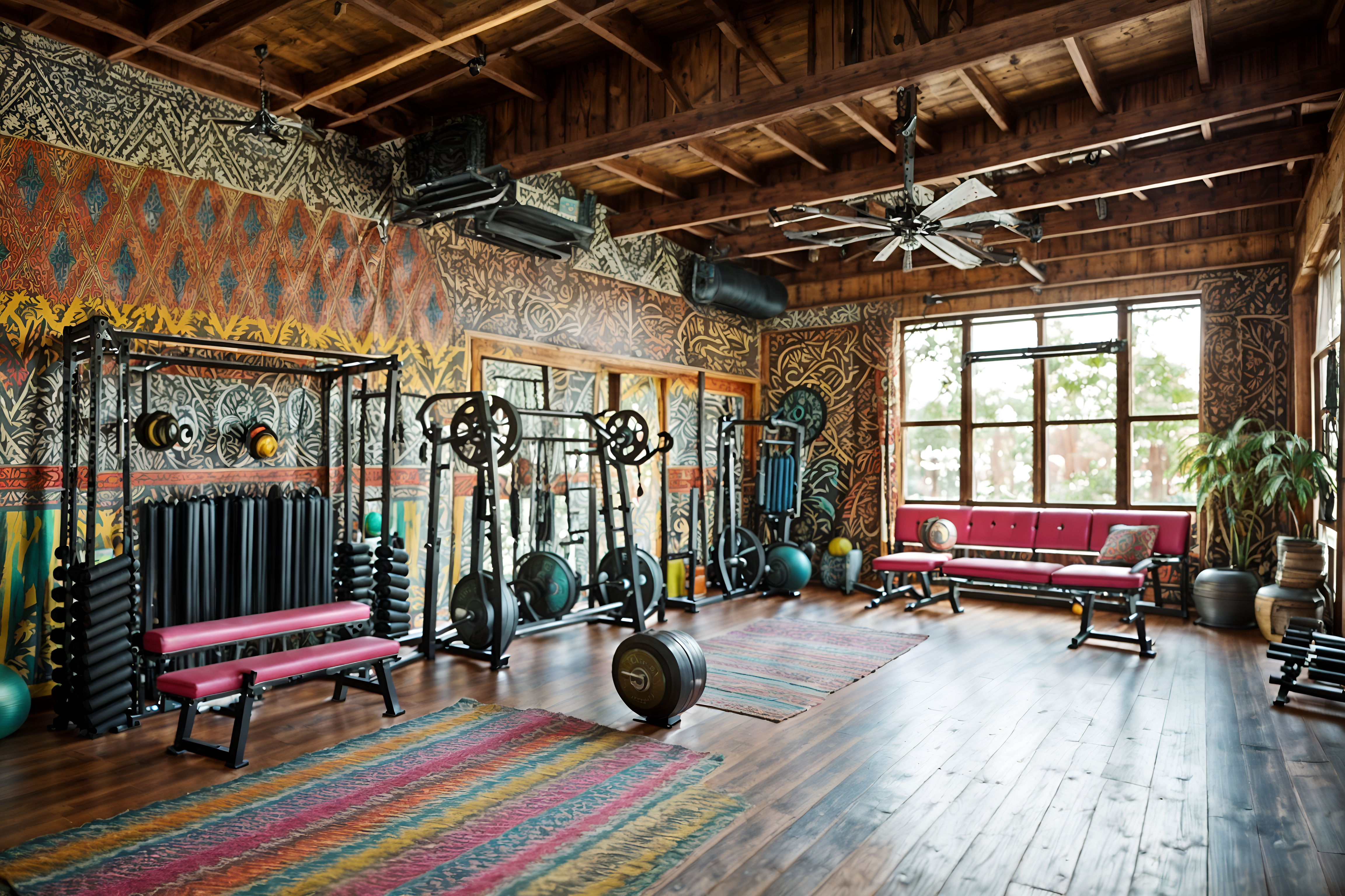 photo from pinterest of bohemian-style interior designed (fitness gym interior) with squat rack and exercise bicycle and crosstrainer and bench press and dumbbell stand and squat rack. . with carefree layers of pattern, texture, and color and metals and playful colors and bold colors and a lack of structure and woods and travel trinkets and bold patterns. . cinematic photo, highly detailed, cinematic lighting, ultra-detailed, ultrarealistic, photorealism, 8k. trending on pinterest. bohemian interior design style. masterpiece, cinematic light, ultrarealistic+, photorealistic+, 8k, raw photo, realistic, sharp focus on eyes, (symmetrical eyes), (intact eyes), hyperrealistic, highest quality, best quality, , highly detailed, masterpiece, best quality, extremely detailed 8k wallpaper, masterpiece, best quality, ultra-detailed, best shadow, detailed background, detailed face, detailed eyes, high contrast, best illumination, detailed face, dulux, caustic, dynamic angle, detailed glow. dramatic lighting. highly detailed, insanely detailed hair, symmetrical, intricate details, professionally retouched, 8k high definition. strong bokeh. award winning photo.