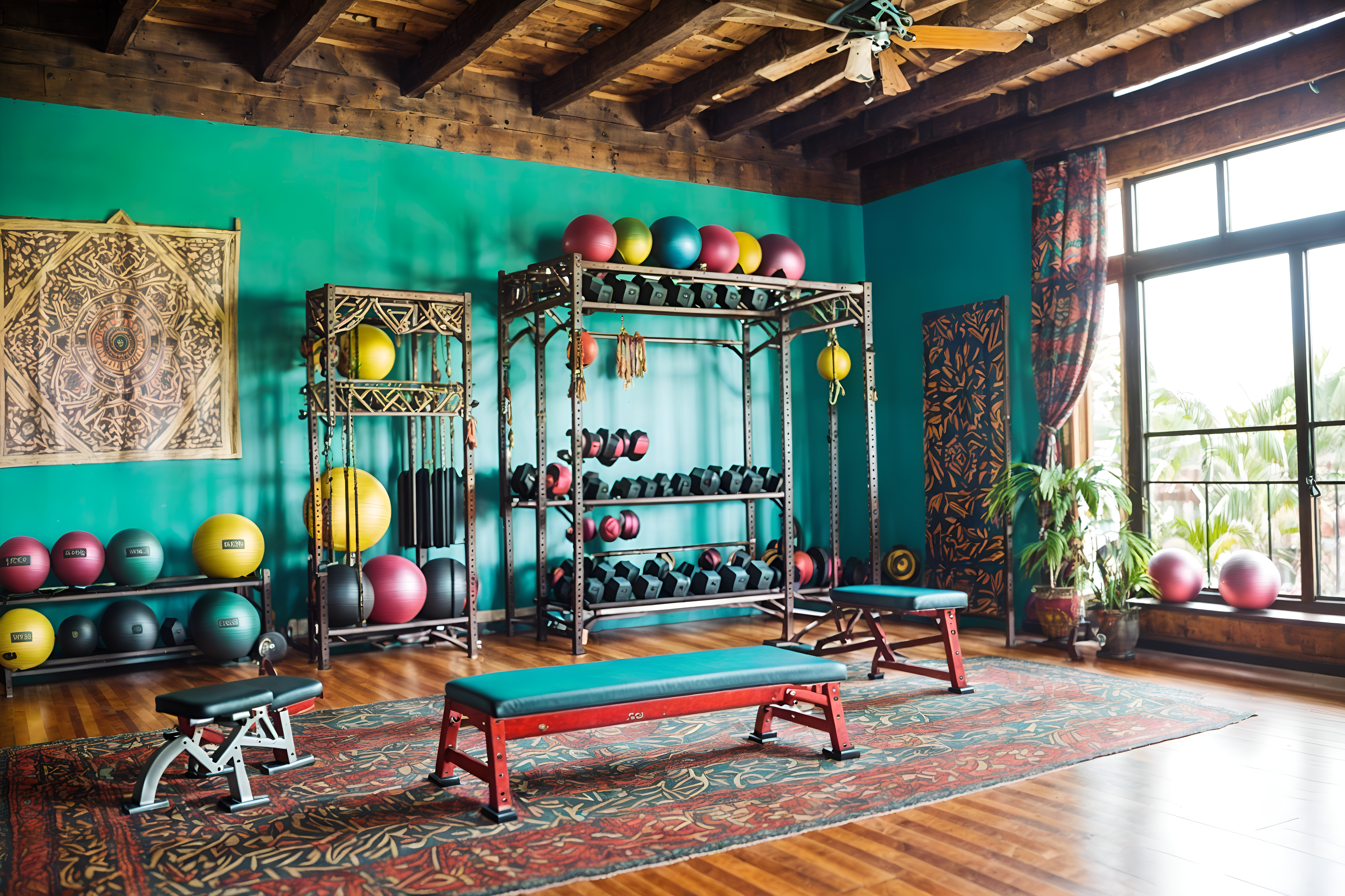 photo from pinterest of bohemian-style interior designed (fitness gym interior) with squat rack and exercise bicycle and crosstrainer and bench press and dumbbell stand and squat rack. . with carefree layers of pattern, texture, and color and metals and playful colors and bold colors and a lack of structure and woods and travel trinkets and bold patterns. . cinematic photo, highly detailed, cinematic lighting, ultra-detailed, ultrarealistic, photorealism, 8k. trending on pinterest. bohemian interior design style. masterpiece, cinematic light, ultrarealistic+, photorealistic+, 8k, raw photo, realistic, sharp focus on eyes, (symmetrical eyes), (intact eyes), hyperrealistic, highest quality, best quality, , highly detailed, masterpiece, best quality, extremely detailed 8k wallpaper, masterpiece, best quality, ultra-detailed, best shadow, detailed background, detailed face, detailed eyes, high contrast, best illumination, detailed face, dulux, caustic, dynamic angle, detailed glow. dramatic lighting. highly detailed, insanely detailed hair, symmetrical, intricate details, professionally retouched, 8k high definition. strong bokeh. award winning photo.
