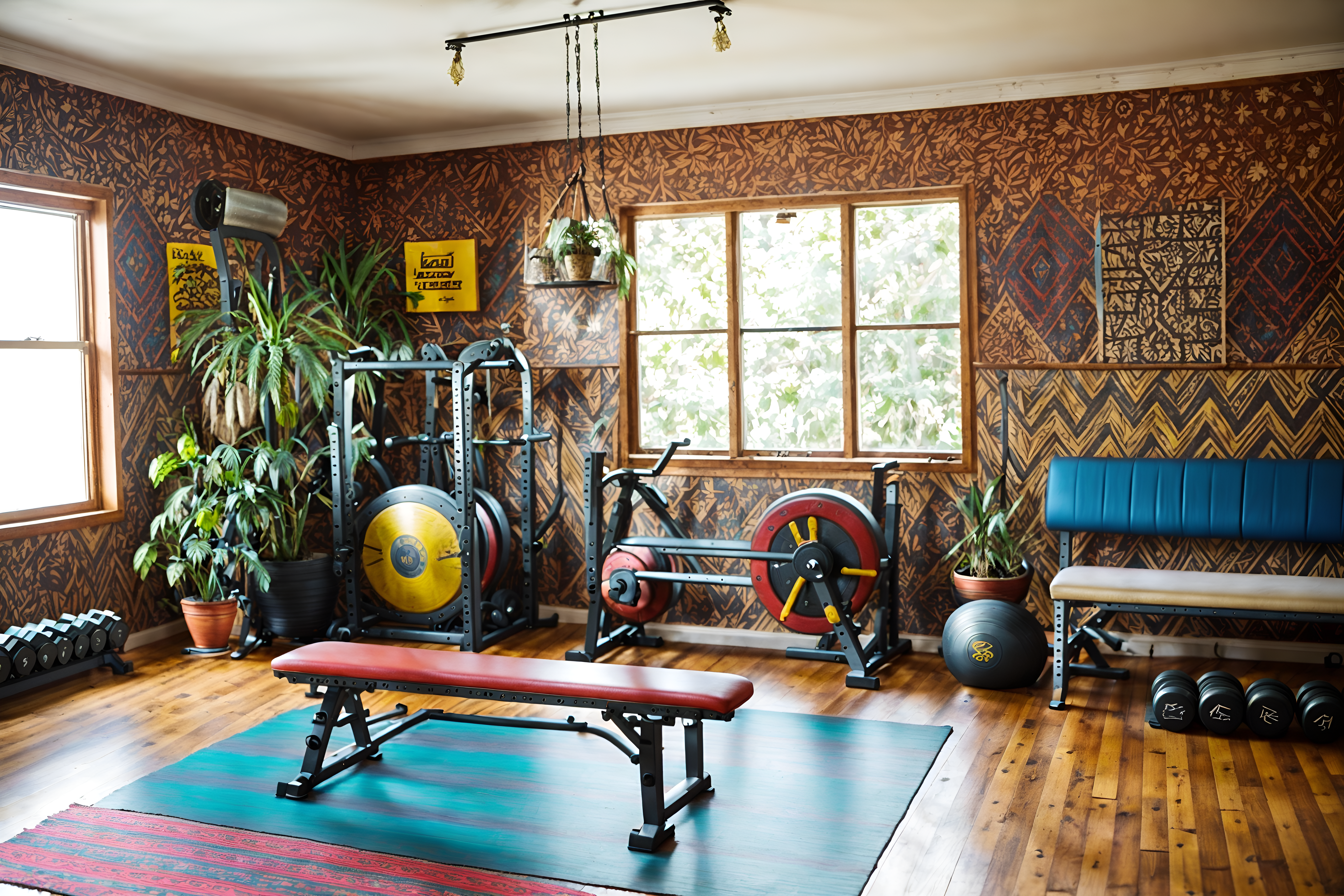 photo from pinterest of bohemian-style interior designed (fitness gym interior) with squat rack and exercise bicycle and crosstrainer and bench press and dumbbell stand and squat rack. . with carefree layers of pattern, texture, and color and metals and playful colors and bold colors and a lack of structure and woods and travel trinkets and bold patterns. . cinematic photo, highly detailed, cinematic lighting, ultra-detailed, ultrarealistic, photorealism, 8k. trending on pinterest. bohemian interior design style. masterpiece, cinematic light, ultrarealistic+, photorealistic+, 8k, raw photo, realistic, sharp focus on eyes, (symmetrical eyes), (intact eyes), hyperrealistic, highest quality, best quality, , highly detailed, masterpiece, best quality, extremely detailed 8k wallpaper, masterpiece, best quality, ultra-detailed, best shadow, detailed background, detailed face, detailed eyes, high contrast, best illumination, detailed face, dulux, caustic, dynamic angle, detailed glow. dramatic lighting. highly detailed, insanely detailed hair, symmetrical, intricate details, professionally retouched, 8k high definition. strong bokeh. award winning photo.