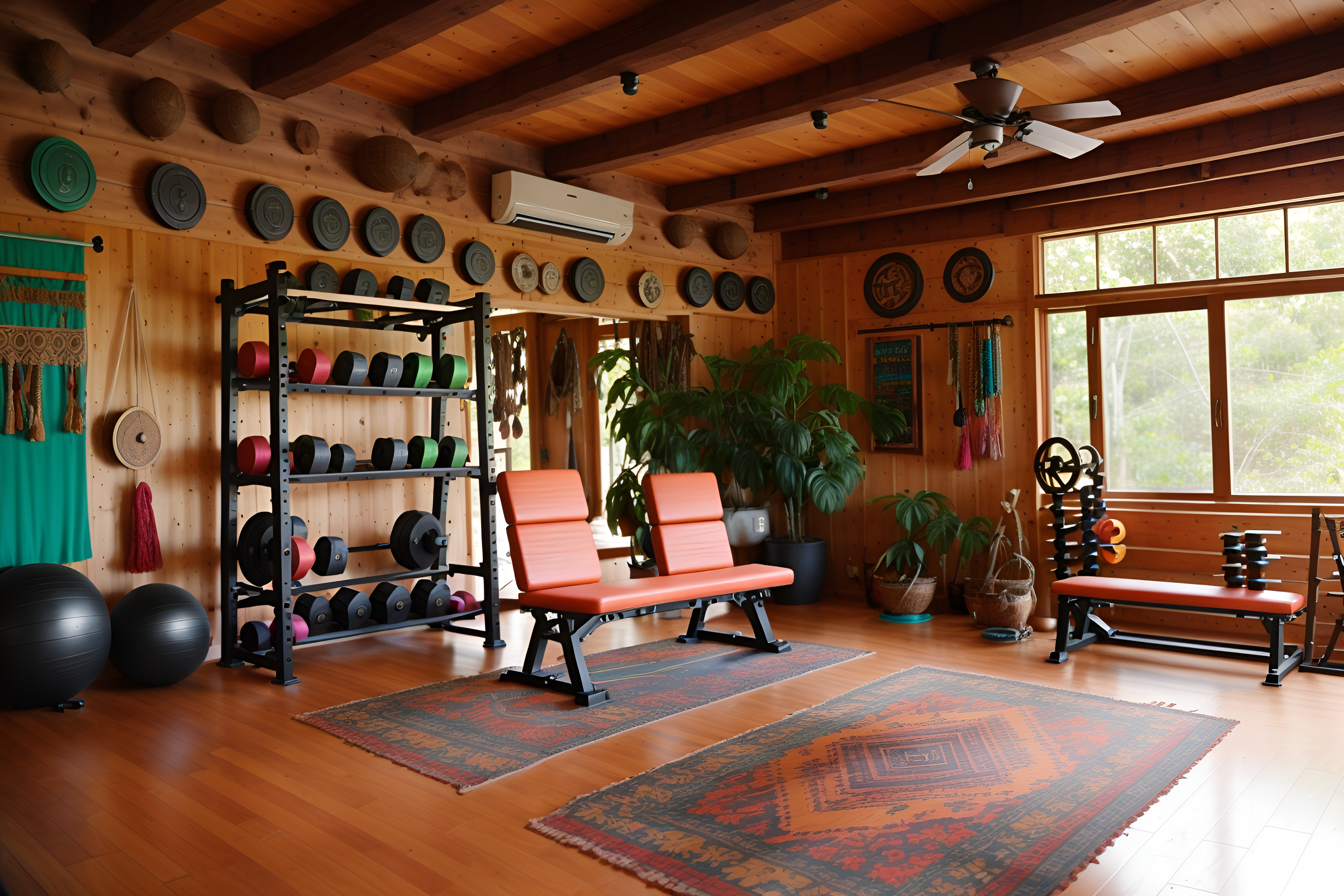 bohemian gymsinterior decorate this fitness gym with bohemian style. . . with exercise bicycle and bench press and squat rack and crosstrainer and dumbbell stand and exercise bicycle. . with a lack of structure and metals and mixed patterns and woods and playful patterns and playful colors and lush green nature and playful textures. . .