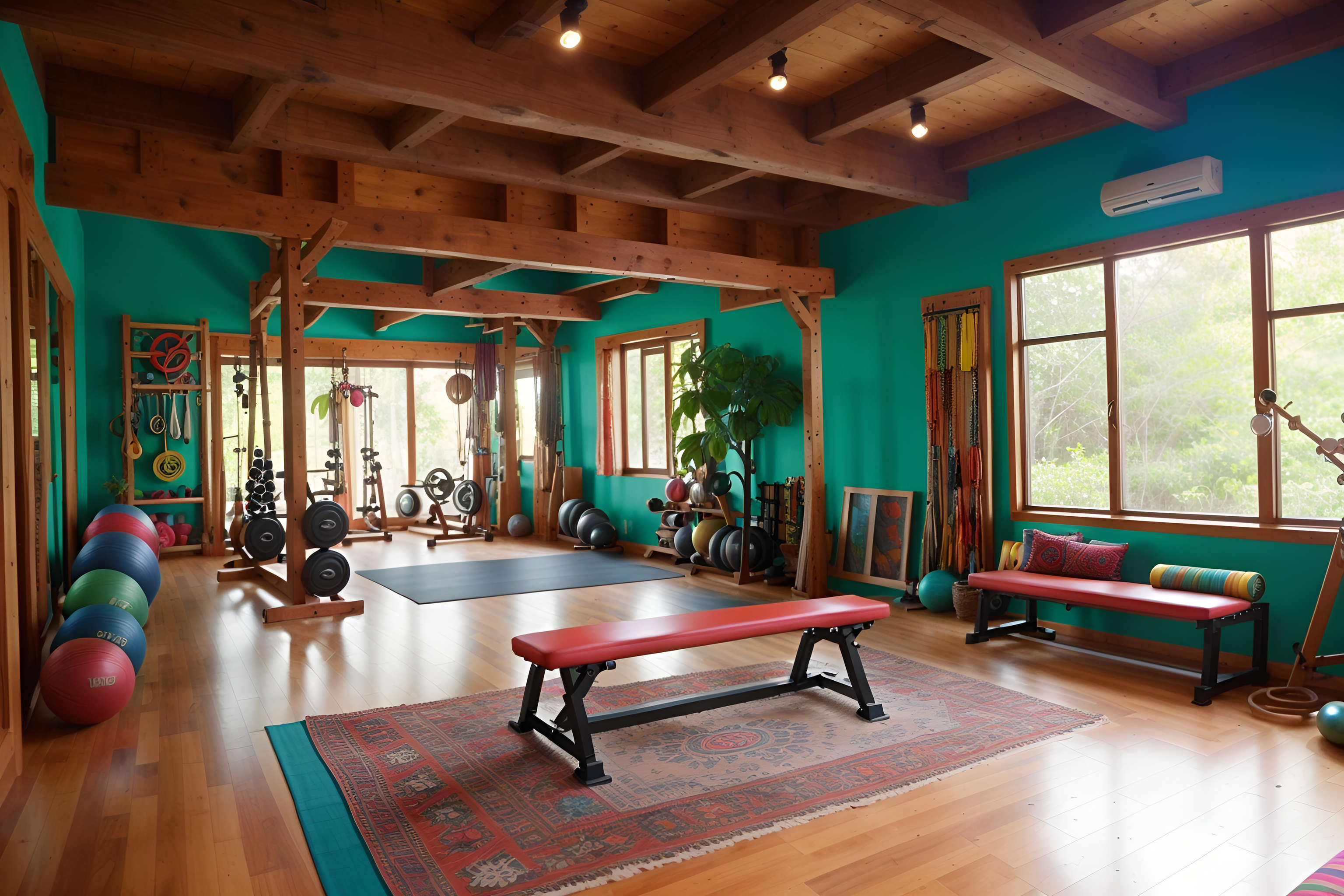 Photo from Pinterest of Bohemian-style interior designed (gym) home interior With crosstrainer and squat rack and exercise bicycle and bench press and dumbbell stand and crosstrainer. . With bold colors and playful colors and woods and mixed patterns and playful textures and travel trinkets and natural materials and a lack of structure. . Cinematic photo, highly detailed, cinematic lighting, ultra-detailed, ultrarealistic, photorealism, 8k. Trending on Pinterest. Bohemian interior design style