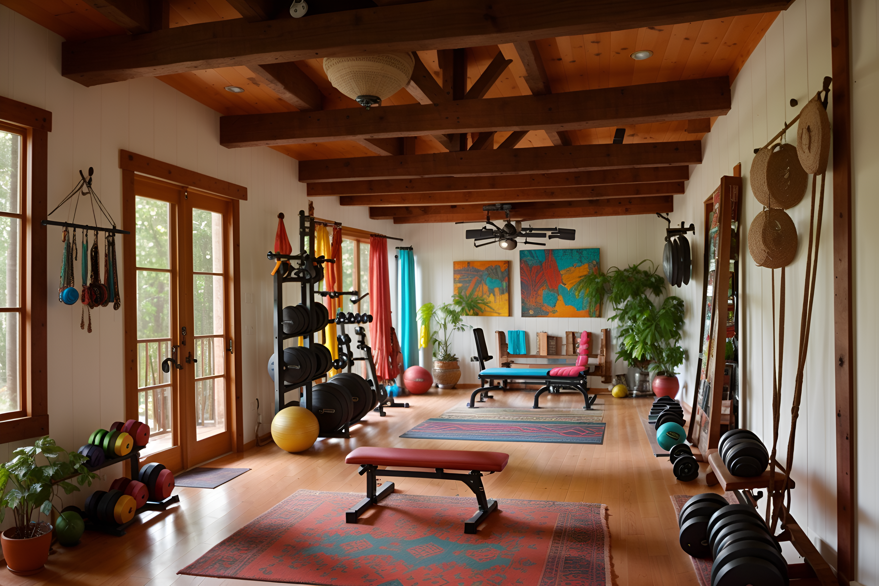 Photo from Pinterest of Bohemian-style interior designed (gym) home interior With crosstrainer and squat rack and exercise bicycle and bench press and dumbbell stand and crosstrainer. . With bold colors and playful colors and woods and mixed patterns and playful textures and travel trinkets and natural materials and a lack of structure. . Cinematic photo, highly detailed, cinematic lighting, ultra-detailed, ultrarealistic, photorealism, 8k. Trending on Pinterest. Bohemian interior design style