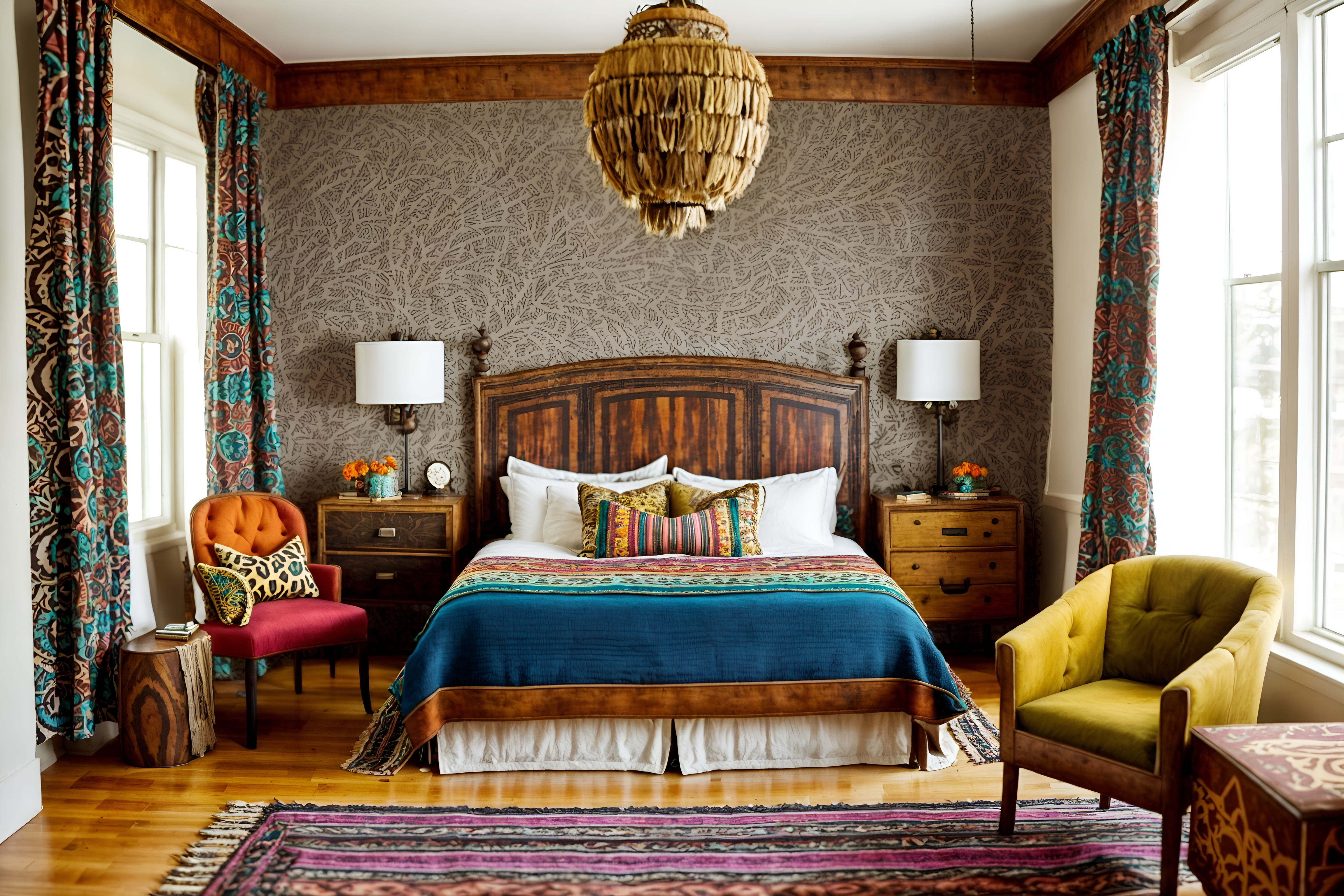 photo from pinterest of bohemian-style interior designed (hotel room interior) with headboard and working desk with desk chair and bed and hotel bathroom and accent chair and dresser closet and mirror and night light. . with woods and animal hides and bold colors and bold patterns and carefree layers of pattern, texture, and color and travel trinkets and playful colors and playful patterns. . cinematic photo, highly detailed, cinematic lighting, ultra-detailed, ultrarealistic, photorealism, 8k. trending on pinterest. bohemian interior design style. masterpiece, cinematic light, ultrarealistic+, photorealistic+, 8k, raw photo, realistic, sharp focus on eyes, (symmetrical eyes), (intact eyes), hyperrealistic, highest quality, best quality, , highly detailed, masterpiece, best quality, extremely detailed 8k wallpaper, masterpiece, best quality, ultra-detailed, best shadow, detailed background, detailed face, detailed eyes, high contrast, best illumination, detailed face, dulux, caustic, dynamic angle, detailed glow. dramatic lighting. highly detailed, insanely detailed hair, symmetrical, intricate details, professionally retouched, 8k high definition. strong bokeh. award winning photo.