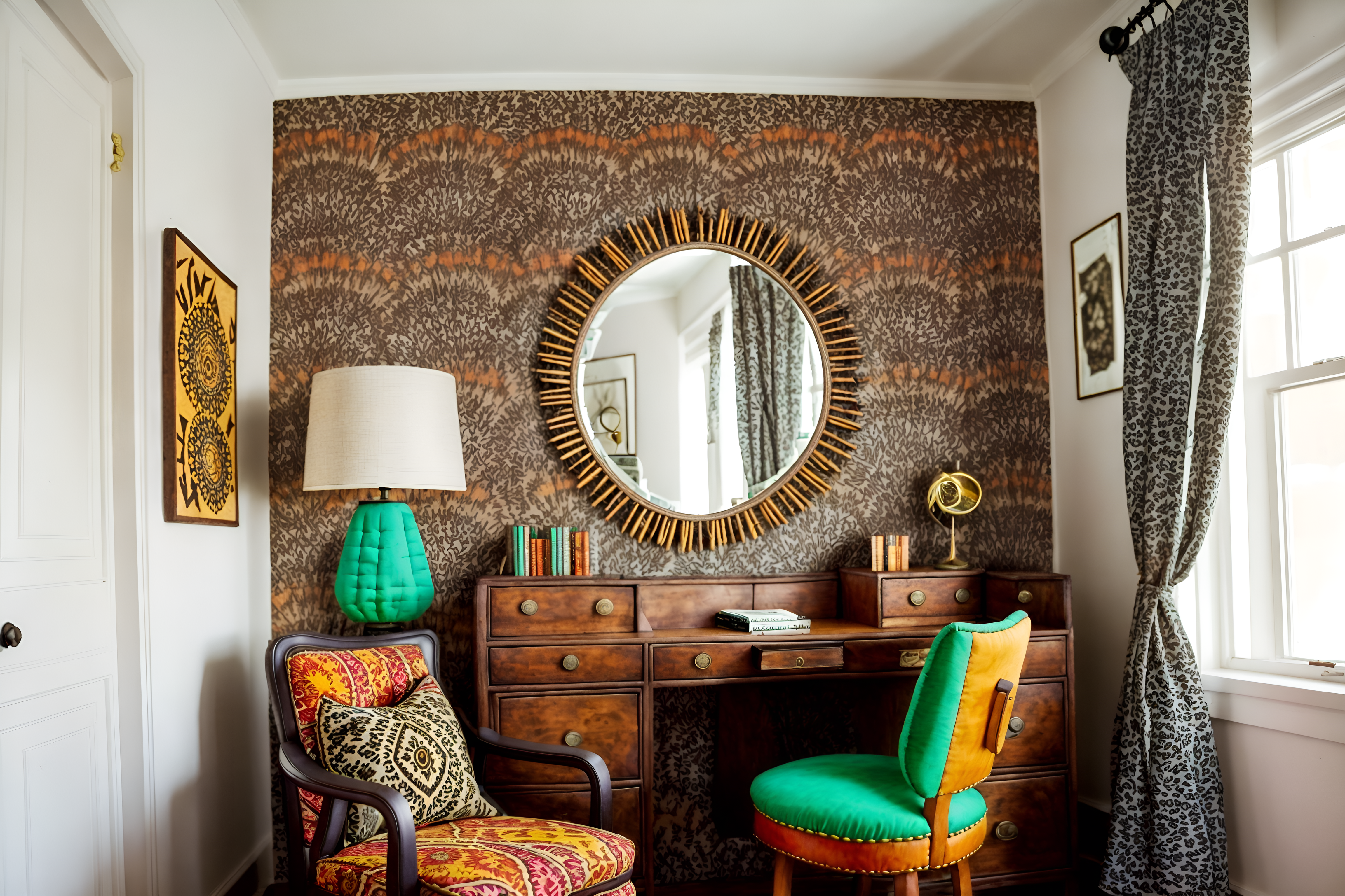 photo from pinterest of bohemian-style interior designed (hotel room interior) with headboard and working desk with desk chair and bed and hotel bathroom and accent chair and dresser closet and mirror and night light. . with woods and animal hides and bold colors and bold patterns and carefree layers of pattern, texture, and color and travel trinkets and playful colors and playful patterns. . cinematic photo, highly detailed, cinematic lighting, ultra-detailed, ultrarealistic, photorealism, 8k. trending on pinterest. bohemian interior design style. masterpiece, cinematic light, ultrarealistic+, photorealistic+, 8k, raw photo, realistic, sharp focus on eyes, (symmetrical eyes), (intact eyes), hyperrealistic, highest quality, best quality, , highly detailed, masterpiece, best quality, extremely detailed 8k wallpaper, masterpiece, best quality, ultra-detailed, best shadow, detailed background, detailed face, detailed eyes, high contrast, best illumination, detailed face, dulux, caustic, dynamic angle, detailed glow. dramatic lighting. highly detailed, insanely detailed hair, symmetrical, intricate details, professionally retouched, 8k high definition. strong bokeh. award winning photo.
