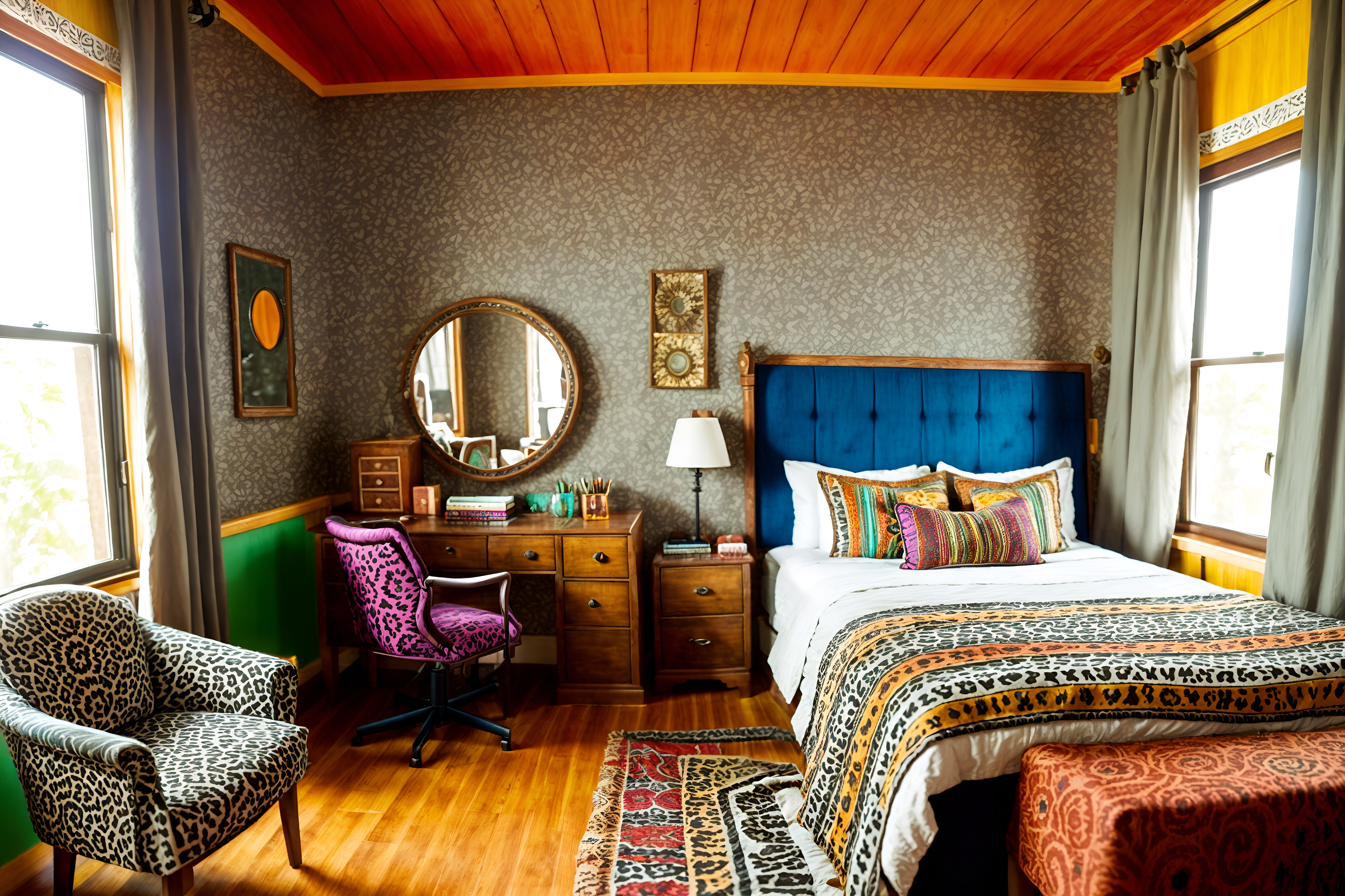 photo from pinterest of bohemian-style interior designed (hotel room interior) with headboard and working desk with desk chair and bed and hotel bathroom and accent chair and dresser closet and mirror and night light. . with woods and animal hides and bold colors and bold patterns and carefree layers of pattern, texture, and color and travel trinkets and playful colors and playful patterns. . cinematic photo, highly detailed, cinematic lighting, ultra-detailed, ultrarealistic, photorealism, 8k. trending on pinterest. bohemian interior design style. masterpiece, cinematic light, ultrarealistic+, photorealistic+, 8k, raw photo, realistic, sharp focus on eyes, (symmetrical eyes), (intact eyes), hyperrealistic, highest quality, best quality, , highly detailed, masterpiece, best quality, extremely detailed 8k wallpaper, masterpiece, best quality, ultra-detailed, best shadow, detailed background, detailed face, detailed eyes, high contrast, best illumination, detailed face, dulux, caustic, dynamic angle, detailed glow. dramatic lighting. highly detailed, insanely detailed hair, symmetrical, intricate details, professionally retouched, 8k high definition. strong bokeh. award winning photo.