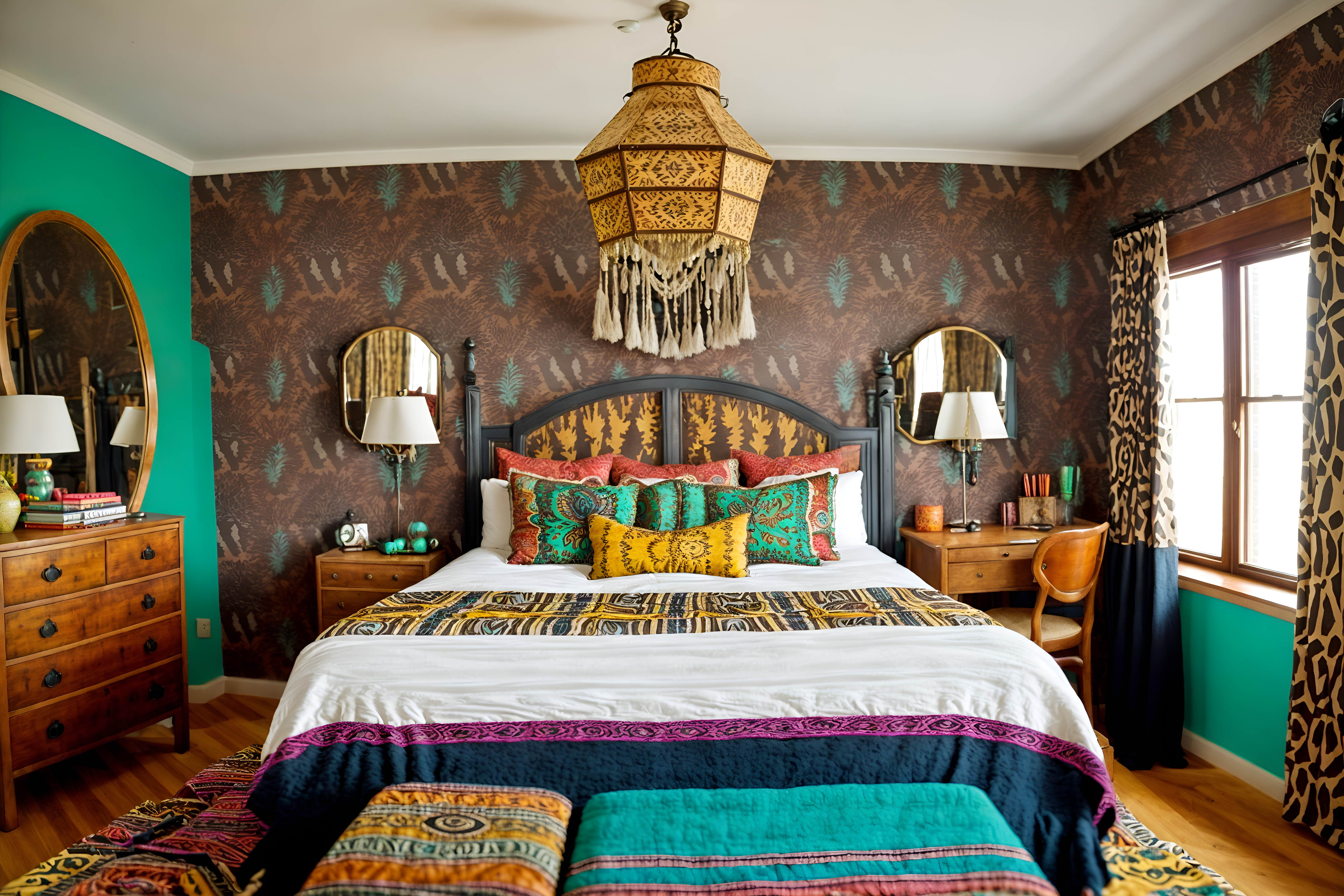 photo from pinterest of bohemian-style interior designed (hotel room interior) with headboard and working desk with desk chair and bed and hotel bathroom and accent chair and dresser closet and mirror and night light. . with woods and animal hides and bold colors and bold patterns and carefree layers of pattern, texture, and color and travel trinkets and playful colors and playful patterns. . cinematic photo, highly detailed, cinematic lighting, ultra-detailed, ultrarealistic, photorealism, 8k. trending on pinterest. bohemian interior design style. masterpiece, cinematic light, ultrarealistic+, photorealistic+, 8k, raw photo, realistic, sharp focus on eyes, (symmetrical eyes), (intact eyes), hyperrealistic, highest quality, best quality, , highly detailed, masterpiece, best quality, extremely detailed 8k wallpaper, masterpiece, best quality, ultra-detailed, best shadow, detailed background, detailed face, detailed eyes, high contrast, best illumination, detailed face, dulux, caustic, dynamic angle, detailed glow. dramatic lighting. highly detailed, insanely detailed hair, symmetrical, intricate details, professionally retouched, 8k high definition. strong bokeh. award winning photo.