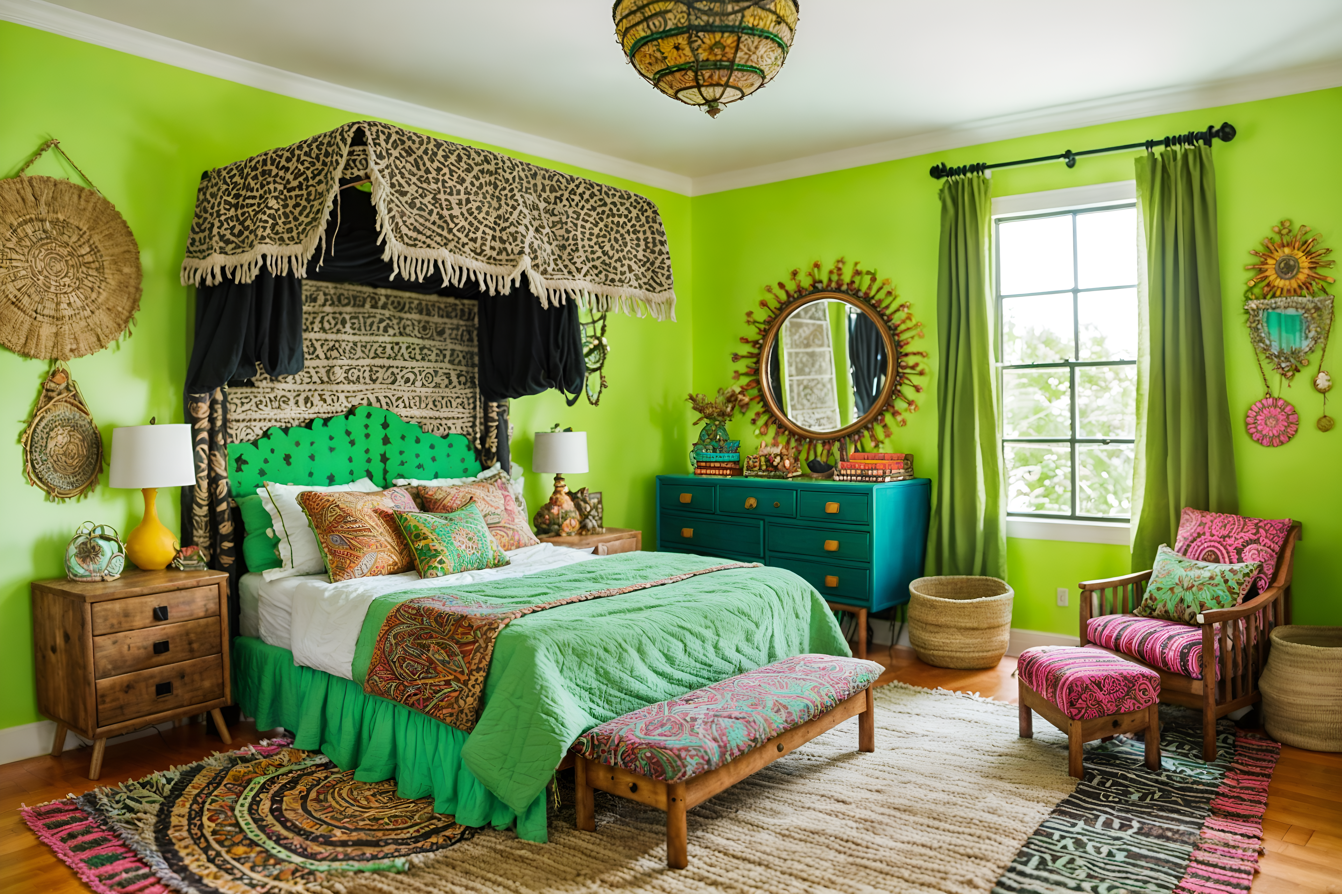 photo from pinterest of bohemian-style interior designed (kids room interior) with mirror and kids desk and storage bench or ottoman and dresser closet and headboard and bedside table or night stand and bed and night light. . with playful textures and natural materials and carefree layers of pattern, texture, and color and bold patterns and mixed patterns and playful colors and lush green nature and travel trinkets. . cinematic photo, highly detailed, cinematic lighting, ultra-detailed, ultrarealistic, photorealism, 8k. trending on pinterest. bohemian interior design style. masterpiece, cinematic light, ultrarealistic+, photorealistic+, 8k, raw photo, realistic, sharp focus on eyes, (symmetrical eyes), (intact eyes), hyperrealistic, highest quality, best quality, , highly detailed, masterpiece, best quality, extremely detailed 8k wallpaper, masterpiece, best quality, ultra-detailed, best shadow, detailed background, detailed face, detailed eyes, high contrast, best illumination, detailed face, dulux, caustic, dynamic angle, detailed glow. dramatic lighting. highly detailed, insanely detailed hair, symmetrical, intricate details, professionally retouched, 8k high definition. strong bokeh. award winning photo.