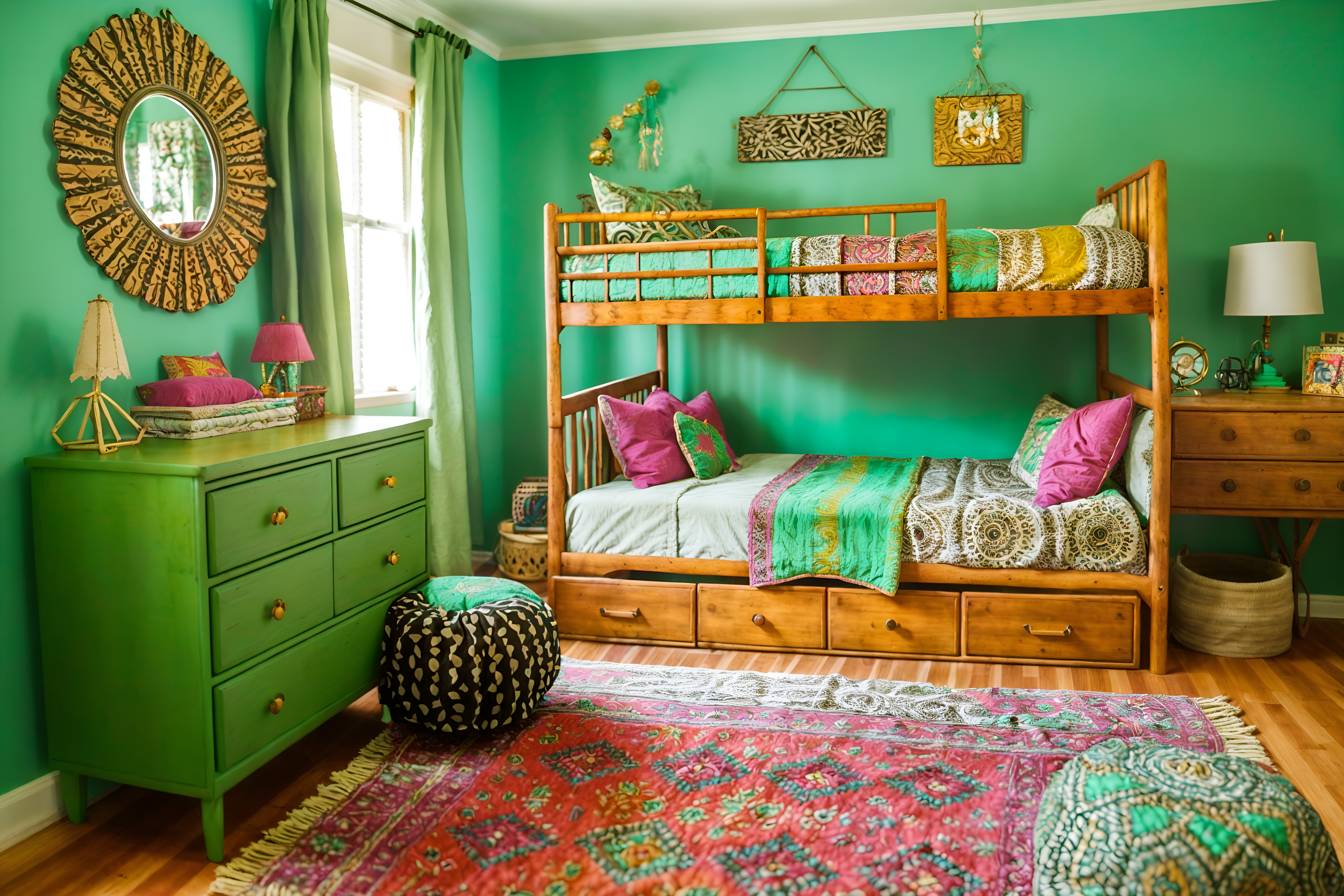 photo from pinterest of bohemian-style interior designed (kids room interior) with mirror and kids desk and storage bench or ottoman and dresser closet and headboard and bedside table or night stand and bed and night light. . with playful textures and natural materials and carefree layers of pattern, texture, and color and bold patterns and mixed patterns and playful colors and lush green nature and travel trinkets. . cinematic photo, highly detailed, cinematic lighting, ultra-detailed, ultrarealistic, photorealism, 8k. trending on pinterest. bohemian interior design style. masterpiece, cinematic light, ultrarealistic+, photorealistic+, 8k, raw photo, realistic, sharp focus on eyes, (symmetrical eyes), (intact eyes), hyperrealistic, highest quality, best quality, , highly detailed, masterpiece, best quality, extremely detailed 8k wallpaper, masterpiece, best quality, ultra-detailed, best shadow, detailed background, detailed face, detailed eyes, high contrast, best illumination, detailed face, dulux, caustic, dynamic angle, detailed glow. dramatic lighting. highly detailed, insanely detailed hair, symmetrical, intricate details, professionally retouched, 8k high definition. strong bokeh. award winning photo.