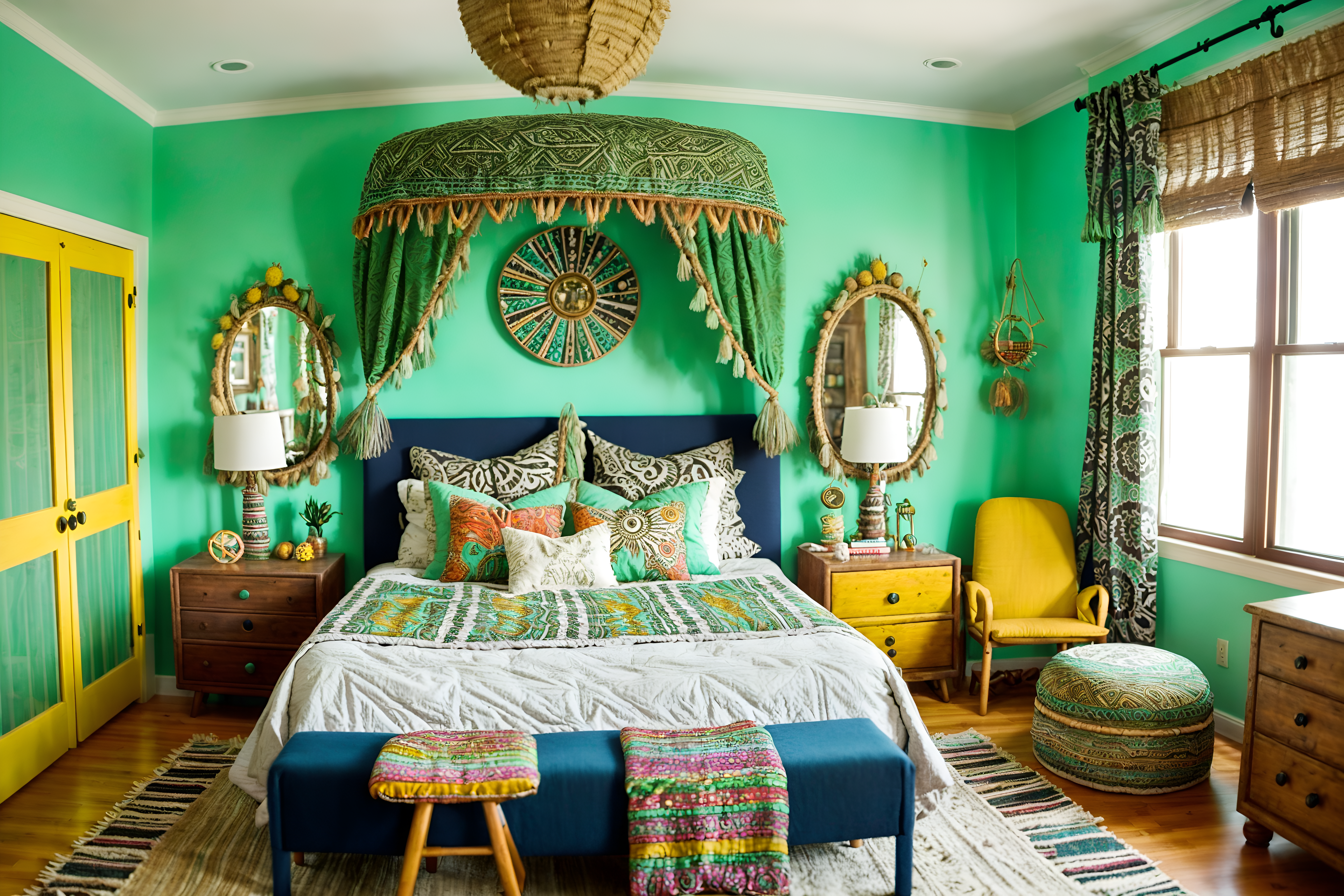 photo from pinterest of bohemian-style interior designed (kids room interior) with mirror and kids desk and storage bench or ottoman and dresser closet and headboard and bedside table or night stand and bed and night light. . with playful textures and natural materials and carefree layers of pattern, texture, and color and bold patterns and mixed patterns and playful colors and lush green nature and travel trinkets. . cinematic photo, highly detailed, cinematic lighting, ultra-detailed, ultrarealistic, photorealism, 8k. trending on pinterest. bohemian interior design style. masterpiece, cinematic light, ultrarealistic+, photorealistic+, 8k, raw photo, realistic, sharp focus on eyes, (symmetrical eyes), (intact eyes), hyperrealistic, highest quality, best quality, , highly detailed, masterpiece, best quality, extremely detailed 8k wallpaper, masterpiece, best quality, ultra-detailed, best shadow, detailed background, detailed face, detailed eyes, high contrast, best illumination, detailed face, dulux, caustic, dynamic angle, detailed glow. dramatic lighting. highly detailed, insanely detailed hair, symmetrical, intricate details, professionally retouched, 8k high definition. strong bokeh. award winning photo.