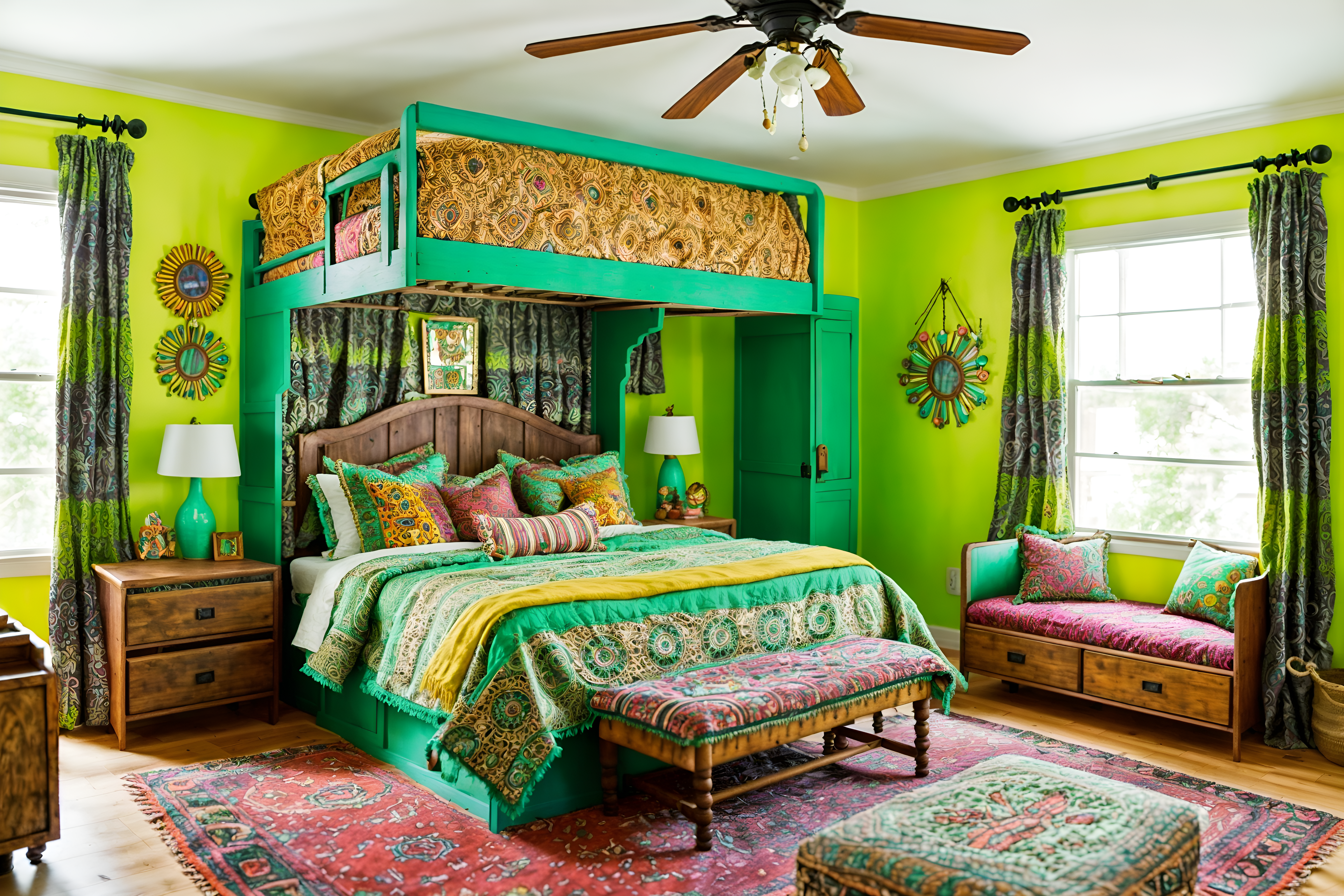 photo from pinterest of bohemian-style interior designed (kids room interior) with mirror and kids desk and storage bench or ottoman and dresser closet and headboard and bedside table or night stand and bed and night light. . with playful textures and natural materials and carefree layers of pattern, texture, and color and bold patterns and mixed patterns and playful colors and lush green nature and travel trinkets. . cinematic photo, highly detailed, cinematic lighting, ultra-detailed, ultrarealistic, photorealism, 8k. trending on pinterest. bohemian interior design style. masterpiece, cinematic light, ultrarealistic+, photorealistic+, 8k, raw photo, realistic, sharp focus on eyes, (symmetrical eyes), (intact eyes), hyperrealistic, highest quality, best quality, , highly detailed, masterpiece, best quality, extremely detailed 8k wallpaper, masterpiece, best quality, ultra-detailed, best shadow, detailed background, detailed face, detailed eyes, high contrast, best illumination, detailed face, dulux, caustic, dynamic angle, detailed glow. dramatic lighting. highly detailed, insanely detailed hair, symmetrical, intricate details, professionally retouched, 8k high definition. strong bokeh. award winning photo.
