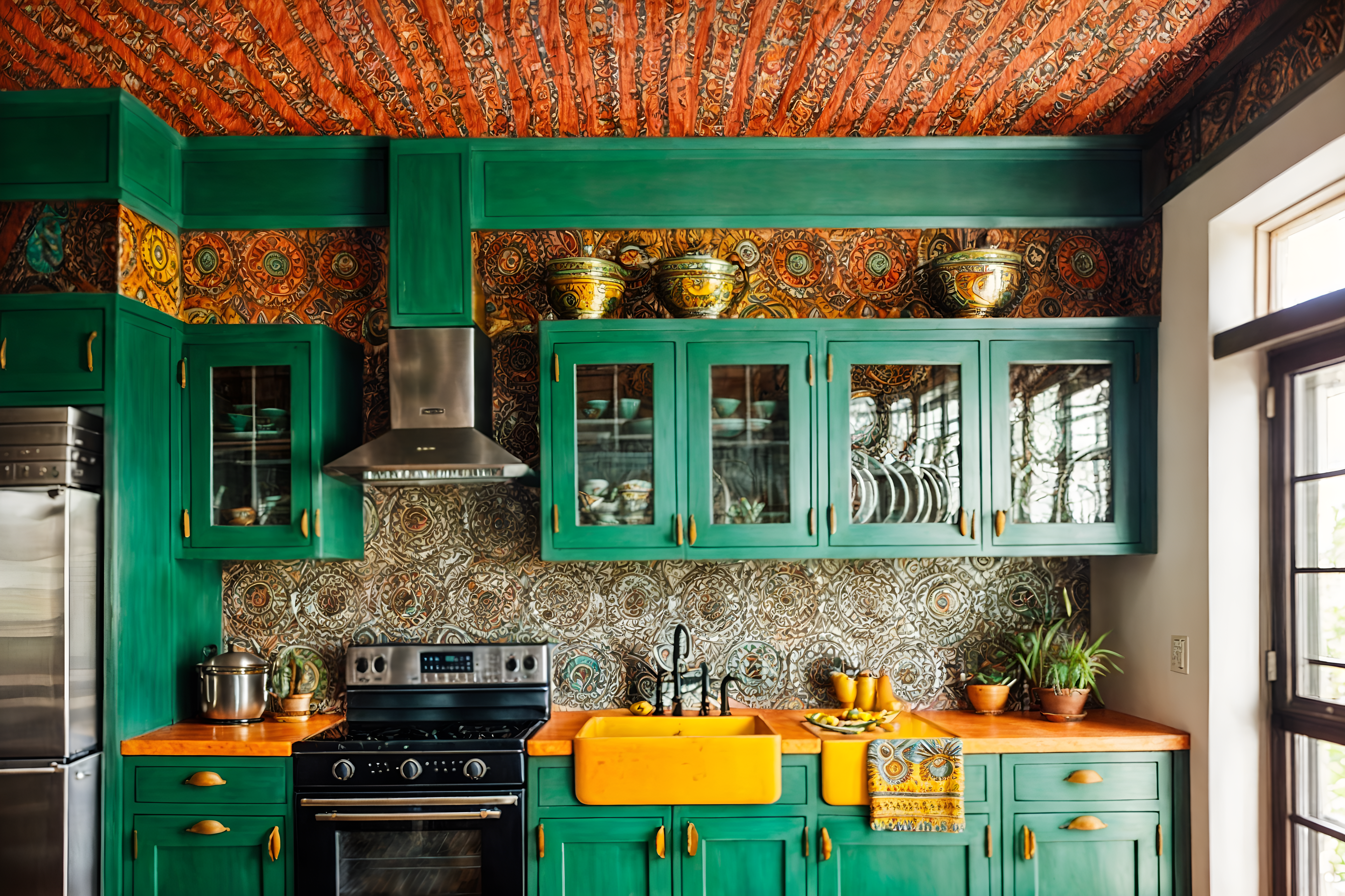 photo from pinterest of bohemian-style interior designed (kitchen interior) with kitchen cabinets and plant and refrigerator and stove and sink and worktops and kitchen cabinets. . with playful textures and a lack of structure and playful patterns and bold colors and playful colors and metals and carefree layers of pattern, texture, and color and animal hides. . cinematic photo, highly detailed, cinematic lighting, ultra-detailed, ultrarealistic, photorealism, 8k. trending on pinterest. bohemian interior design style. masterpiece, cinematic light, ultrarealistic+, photorealistic+, 8k, raw photo, realistic, sharp focus on eyes, (symmetrical eyes), (intact eyes), hyperrealistic, highest quality, best quality, , highly detailed, masterpiece, best quality, extremely detailed 8k wallpaper, masterpiece, best quality, ultra-detailed, best shadow, detailed background, detailed face, detailed eyes, high contrast, best illumination, detailed face, dulux, caustic, dynamic angle, detailed glow. dramatic lighting. highly detailed, insanely detailed hair, symmetrical, intricate details, professionally retouched, 8k high definition. strong bokeh. award winning photo.