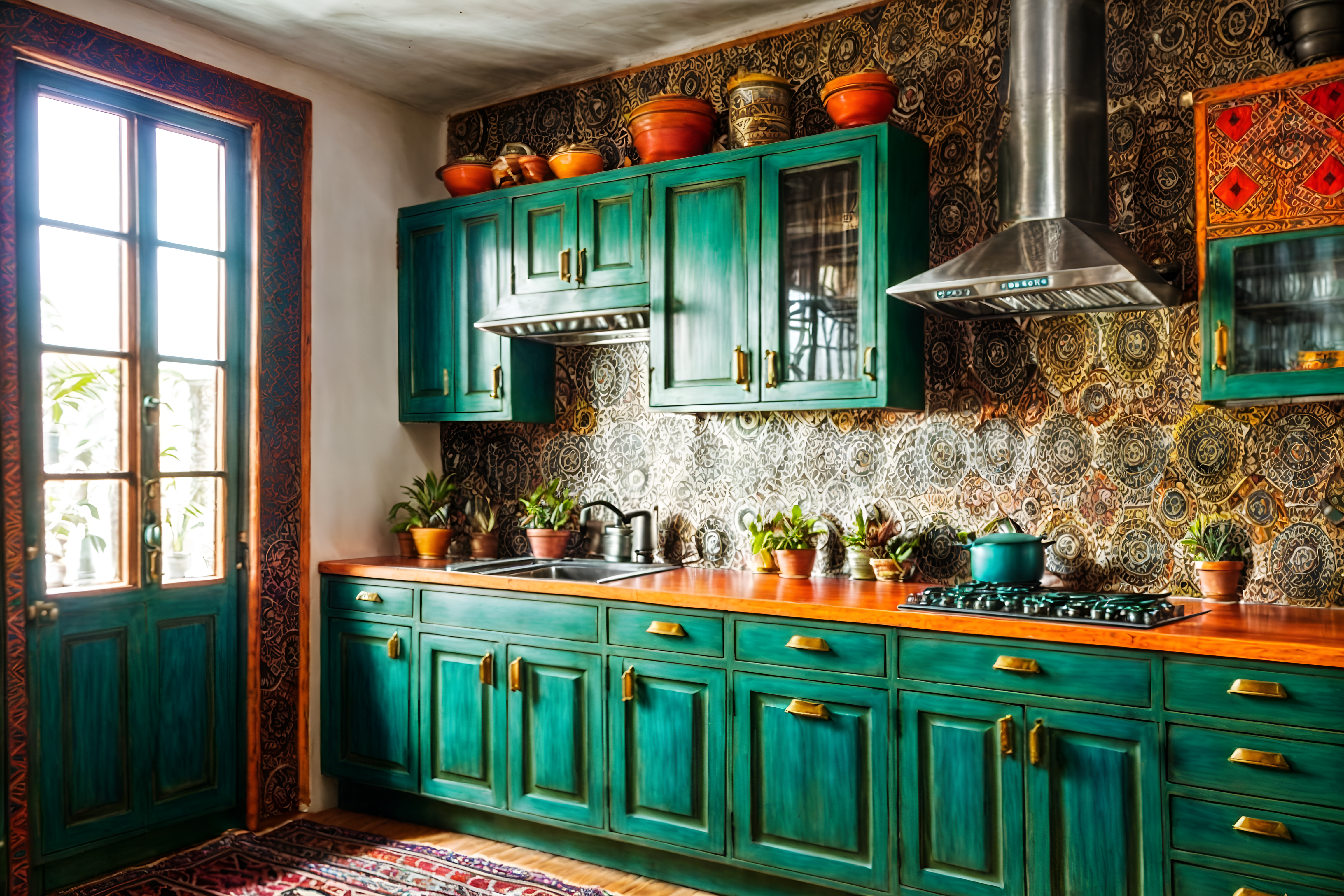 photo from pinterest of bohemian-style interior designed (kitchen interior) with kitchen cabinets and plant and refrigerator and stove and sink and worktops and kitchen cabinets. . with playful textures and a lack of structure and playful patterns and bold colors and playful colors and metals and carefree layers of pattern, texture, and color and animal hides. . cinematic photo, highly detailed, cinematic lighting, ultra-detailed, ultrarealistic, photorealism, 8k. trending on pinterest. bohemian interior design style. masterpiece, cinematic light, ultrarealistic+, photorealistic+, 8k, raw photo, realistic, sharp focus on eyes, (symmetrical eyes), (intact eyes), hyperrealistic, highest quality, best quality, , highly detailed, masterpiece, best quality, extremely detailed 8k wallpaper, masterpiece, best quality, ultra-detailed, best shadow, detailed background, detailed face, detailed eyes, high contrast, best illumination, detailed face, dulux, caustic, dynamic angle, detailed glow. dramatic lighting. highly detailed, insanely detailed hair, symmetrical, intricate details, professionally retouched, 8k high definition. strong bokeh. award winning photo.