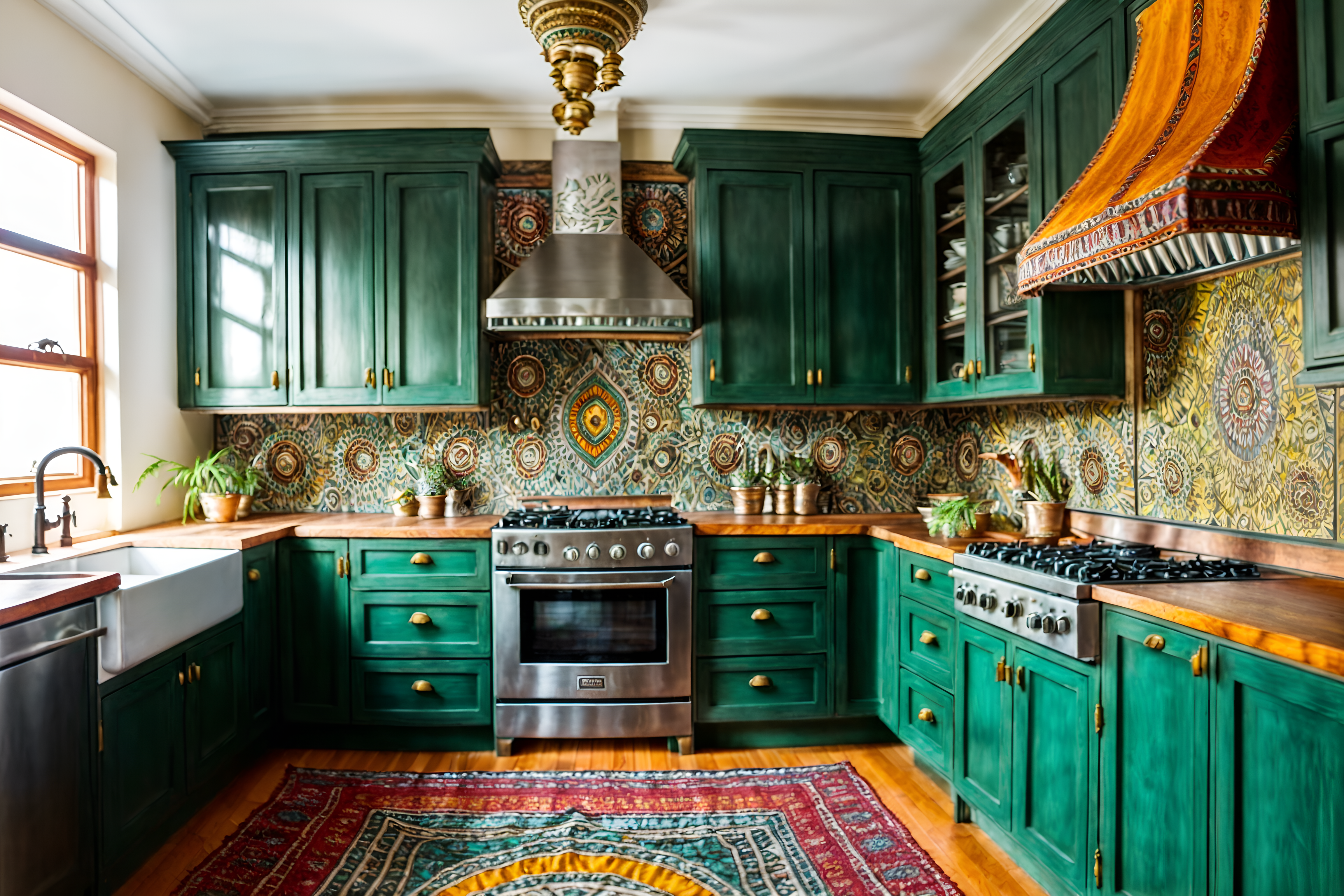 photo from pinterest of bohemian-style interior designed (kitchen interior) with kitchen cabinets and plant and refrigerator and stove and sink and worktops and kitchen cabinets. . with playful textures and a lack of structure and playful patterns and bold colors and playful colors and metals and carefree layers of pattern, texture, and color and animal hides. . cinematic photo, highly detailed, cinematic lighting, ultra-detailed, ultrarealistic, photorealism, 8k. trending on pinterest. bohemian interior design style. masterpiece, cinematic light, ultrarealistic+, photorealistic+, 8k, raw photo, realistic, sharp focus on eyes, (symmetrical eyes), (intact eyes), hyperrealistic, highest quality, best quality, , highly detailed, masterpiece, best quality, extremely detailed 8k wallpaper, masterpiece, best quality, ultra-detailed, best shadow, detailed background, detailed face, detailed eyes, high contrast, best illumination, detailed face, dulux, caustic, dynamic angle, detailed glow. dramatic lighting. highly detailed, insanely detailed hair, symmetrical, intricate details, professionally retouched, 8k high definition. strong bokeh. award winning photo.