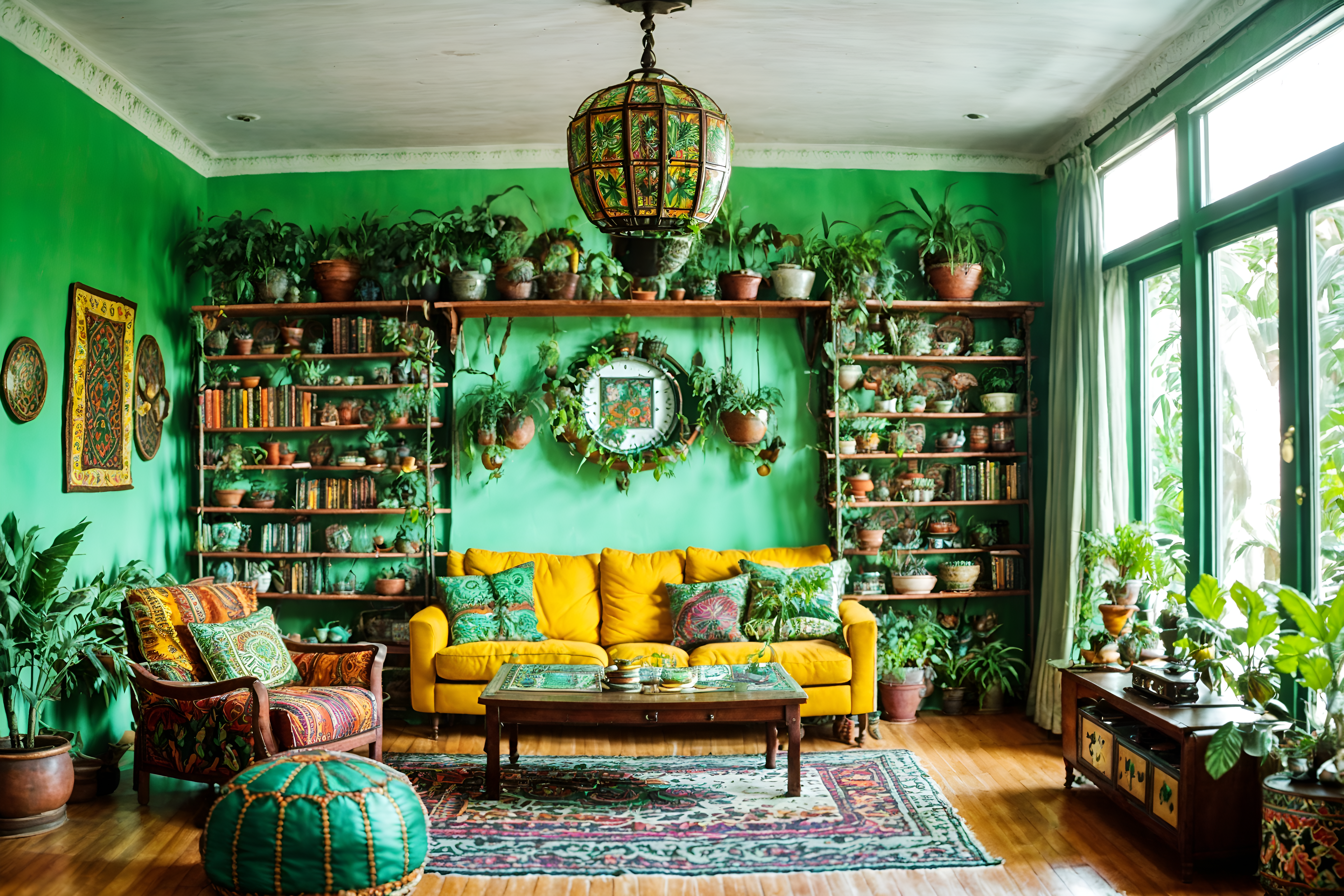 photo from pinterest of bohemian-style interior designed (kitchen living combo interior) with electric lamps and furniture and plant and bookshelves and plant and sink and televisions and chairs. . with a lack of structure and travel trinkets and mixed patterns and bold patterns and bold colors and animal hides and lush green nature and playful patterns. . cinematic photo, highly detailed, cinematic lighting, ultra-detailed, ultrarealistic, photorealism, 8k. trending on pinterest. bohemian interior design style. masterpiece, cinematic light, ultrarealistic+, photorealistic+, 8k, raw photo, realistic, sharp focus on eyes, (symmetrical eyes), (intact eyes), hyperrealistic, highest quality, best quality, , highly detailed, masterpiece, best quality, extremely detailed 8k wallpaper, masterpiece, best quality, ultra-detailed, best shadow, detailed background, detailed face, detailed eyes, high contrast, best illumination, detailed face, dulux, caustic, dynamic angle, detailed glow. dramatic lighting. highly detailed, insanely detailed hair, symmetrical, intricate details, professionally retouched, 8k high definition. strong bokeh. award winning photo.