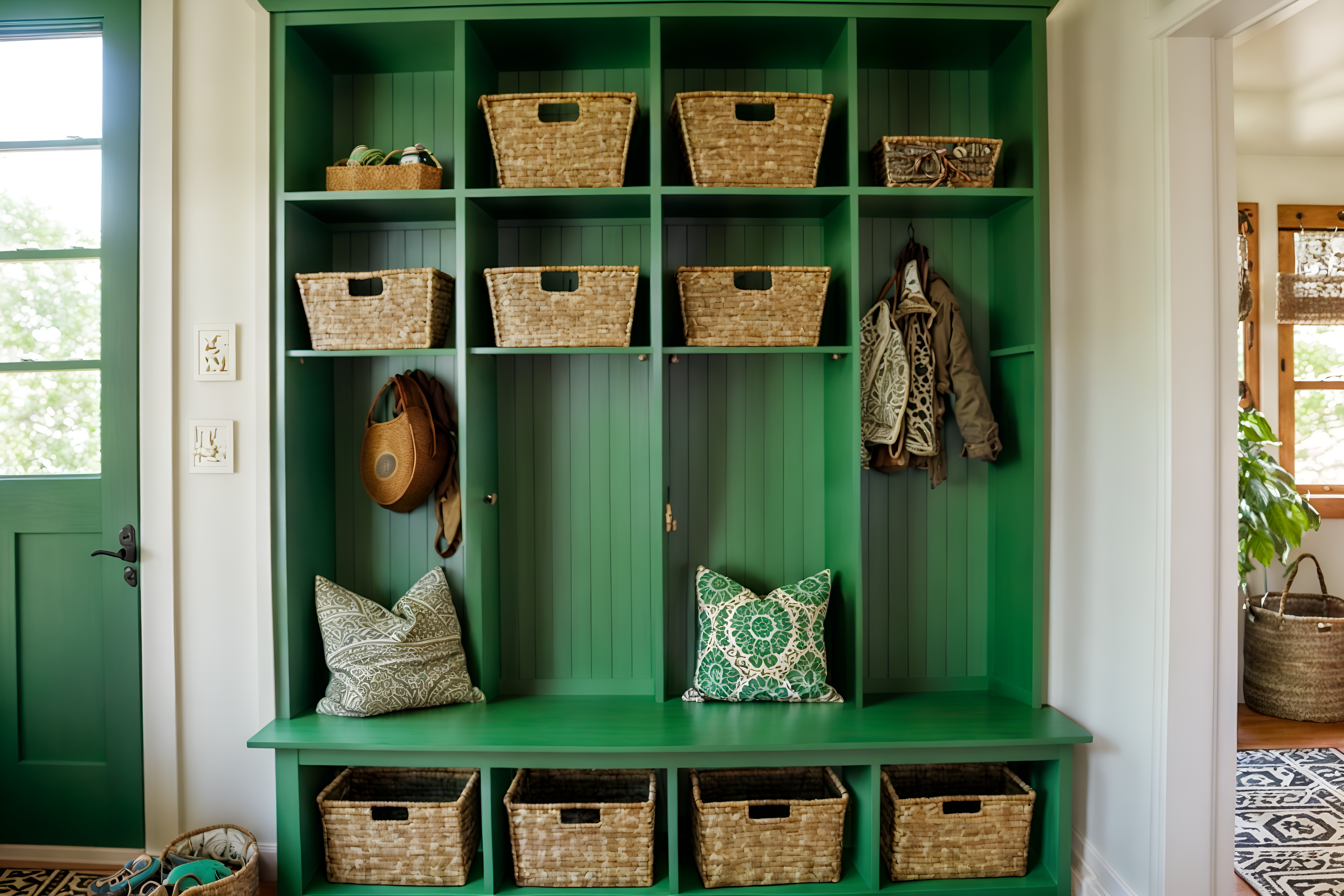 photo from pinterest of bohemian-style interior designed (mudroom interior) with cubbies and storage baskets and high up storage and storage drawers and shelves for shoes and wall hooks for coats and a bench and cabinets. . with carefree layers of pattern, texture, and color and a lack of structure and animal hides and playful colors and mixed patterns and natural materials and bold patterns and lush green nature. . cinematic photo, highly detailed, cinematic lighting, ultra-detailed, ultrarealistic, photorealism, 8k. trending on pinterest. bohemian interior design style. masterpiece, cinematic light, ultrarealistic+, photorealistic+, 8k, raw photo, realistic, sharp focus on eyes, (symmetrical eyes), (intact eyes), hyperrealistic, highest quality, best quality, , highly detailed, masterpiece, best quality, extremely detailed 8k wallpaper, masterpiece, best quality, ultra-detailed, best shadow, detailed background, detailed face, detailed eyes, high contrast, best illumination, detailed face, dulux, caustic, dynamic angle, detailed glow. dramatic lighting. highly detailed, insanely detailed hair, symmetrical, intricate details, professionally retouched, 8k high definition. strong bokeh. award winning photo.
